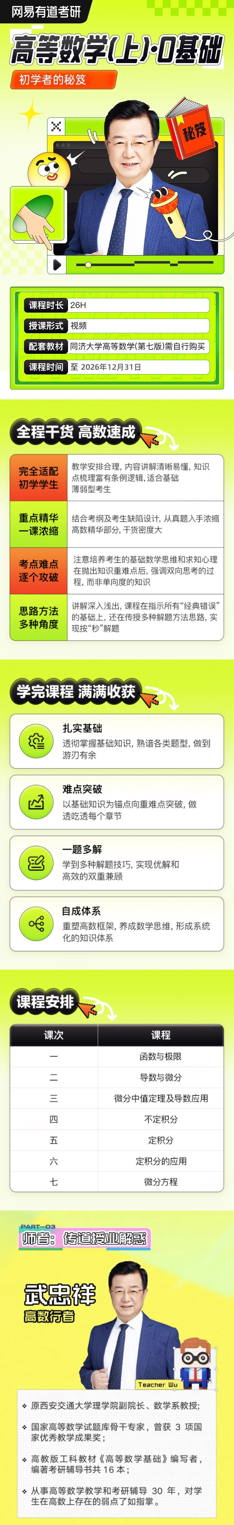 专为27考研考生打造的高等数学(上)0基础入门课程,由老师武忠祥全程授课,精准适配基础薄弱、零基础的初学者,以同济大学《高等数学》第七版为核心教材,搭建从入门到扎实掌握的系统化备考路径;超长周期覆盖考研高数备考关键阶段,满足不同复习节奏需求。