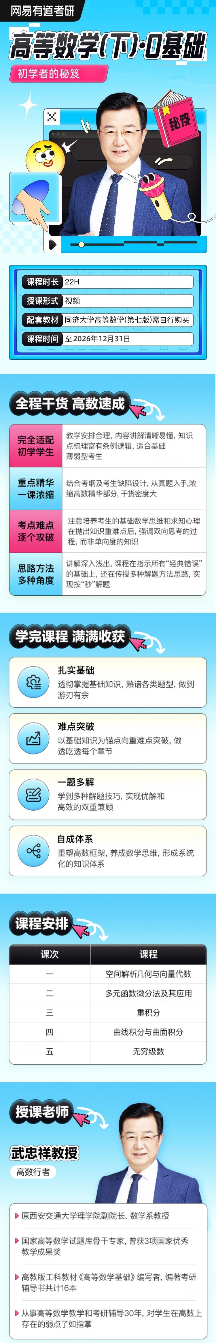 专为27考研考生打造的高等数学(下)0基础入门课程,由权威老师武忠祥全程授课,精准适配基础薄弱、零基础的初学者,以同济大学《高等数学》第七版为核心教材,搭建从入门到系统化掌握的高效备考路径;超长周期覆盖考研高数备考关键阶段,满足不同复习节奏需求。