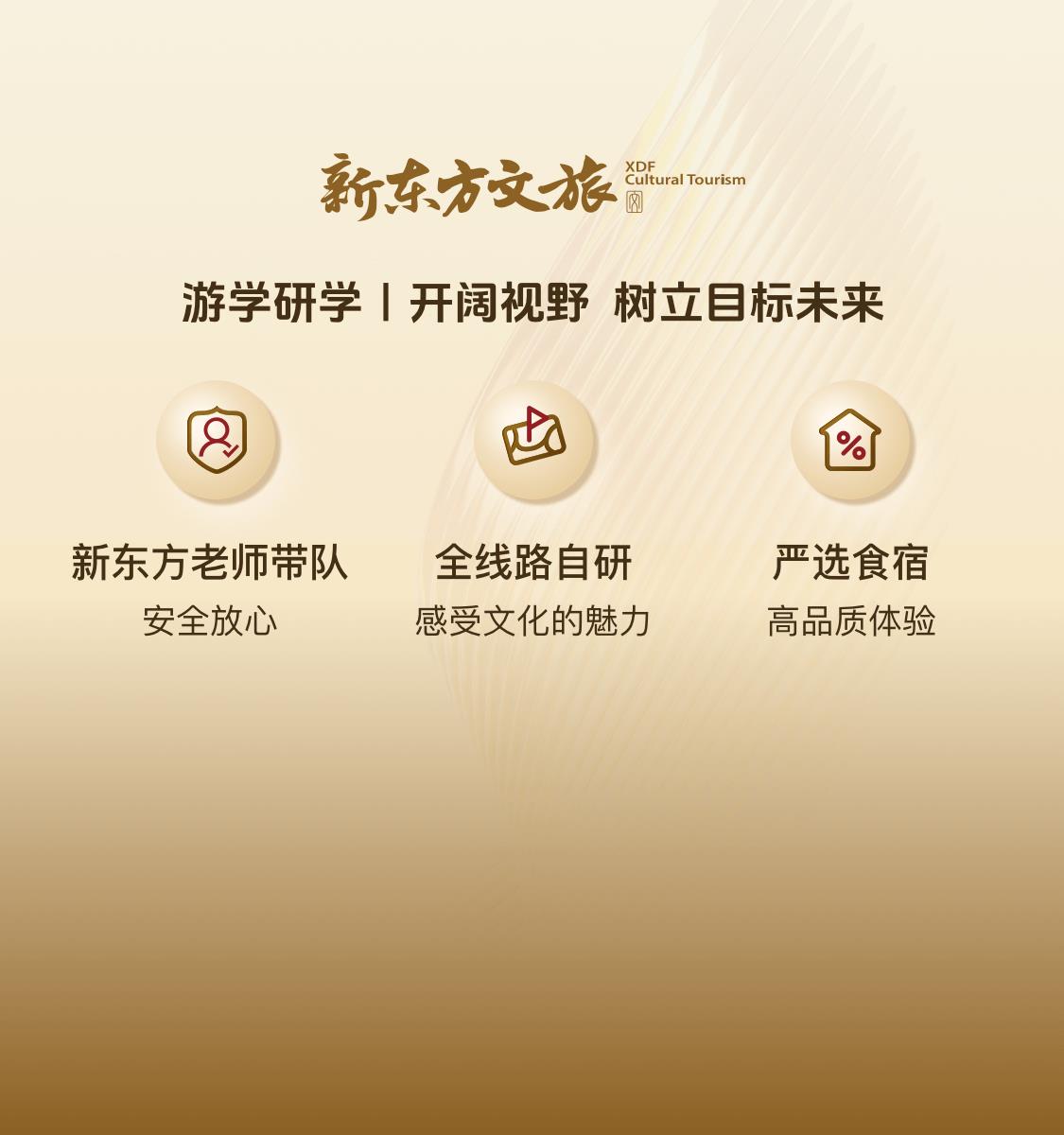 机构简介:1993年北京新东方学校成立,而后壮大为新东方科技集团。从教育领域出发,经过32年创新发展,集团业务目前已涵盖教育服务、生活服务、文旅服务三大领域。2005年北京新东方游学、研学、营地开始营运,到2023年正式开拓文旅版图。依托新东方32年知识传播和优质师资优势,新东方文旅集团面向中老年、亲子及青少年群体提供康养旅居、文化旅游、研学、国际游学和营地教育等高品质服务,致力于满足不同群体的精神需求、成长需求、社交需求。从教育、生活到文旅服务,我们将奋楫笃行,打造有文化幸福感、有知识获得感、有个人追求感的高品质文旅体验。愿景使命打造有知识获得感、文化幸福感、个人追求感的高品质文旅服务。 作为中国游学行业的开拓者和引领者,新东方文旅希望能够打造安全、高品质、专业的中国国际游学行业知名教育品牌,让孩子们早日去了解世界,让孩子们把世界带回中国! 基于北京新东方学校32年的教育经验优势,新东方文旅希望能让有着丰富知识内涵的新东方老师们,成为热爱分享文化与知识的导游,带着人们在行走的过程中,穿越时空,眺望那些曾经的历史故事与人生海海,在岁月与文明中,去感知那些伟大的精神和厚重的中国文化!6 大类核心竞争力6 种高端产品项目3 类商务定制案例1 套产品定制流程