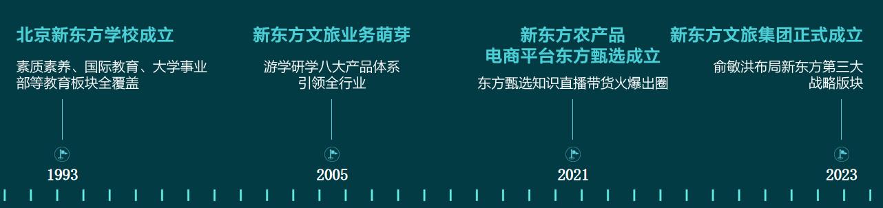 1993年北京新东方学校成立,而后壮大为新东方科技集团。从教育领域出发,经过32年创新发展,集团业务目前已涵盖教育服务、生活服务、文旅服务三大领域。 2005年北京新东方游学、研学、营地开始营运,到2023年正式开拓文旅版图。依托新东方32年知识传播和优质师资优势,新东方文旅集团面向中老年、亲子及青少年群体提供康养旅居、文化旅游、研学、国际游学和营地教育等高品质服务,致力于满足不同群体的精神需求、成长需求、社交需求。 从教育、生活到文旅服务,我们将奋楫笃行,打造有文化幸福感、有知识获得感、有个人追求感的高品质文旅体验。
