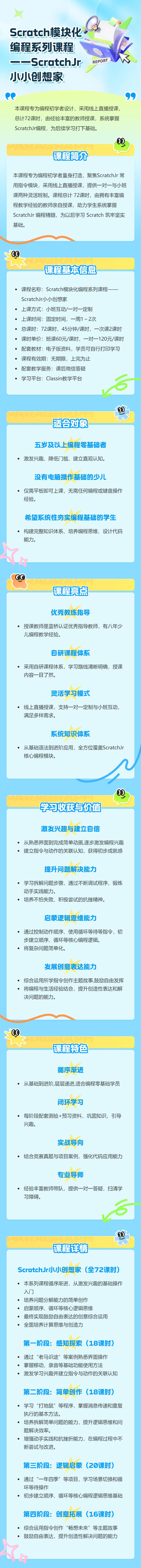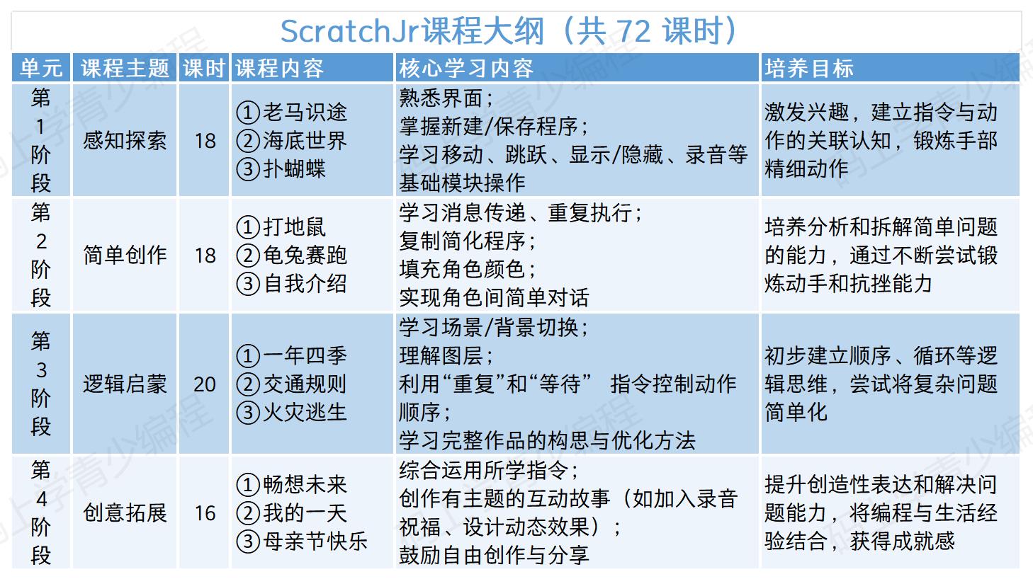 本课程专为编程初学者量身打造,聚焦ScratchJr常用指令模块,采用线上直播授课,提供一对一与小班课两种灵活班制。课程总计72课时,由拥有丰富编程教学经验的教师亲自授课,助力学生系统掌握ScratchJr编程精髓,为以后学习Scratch筑牢坚实基础