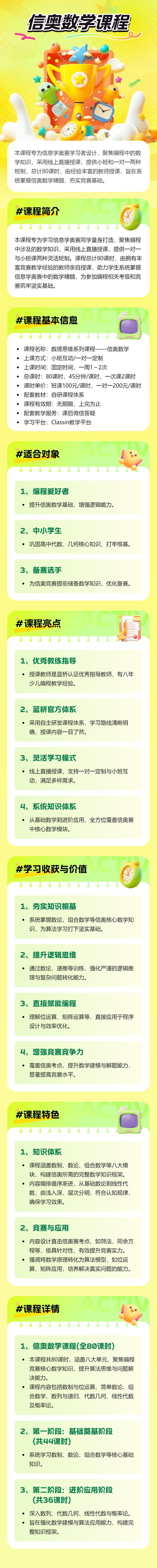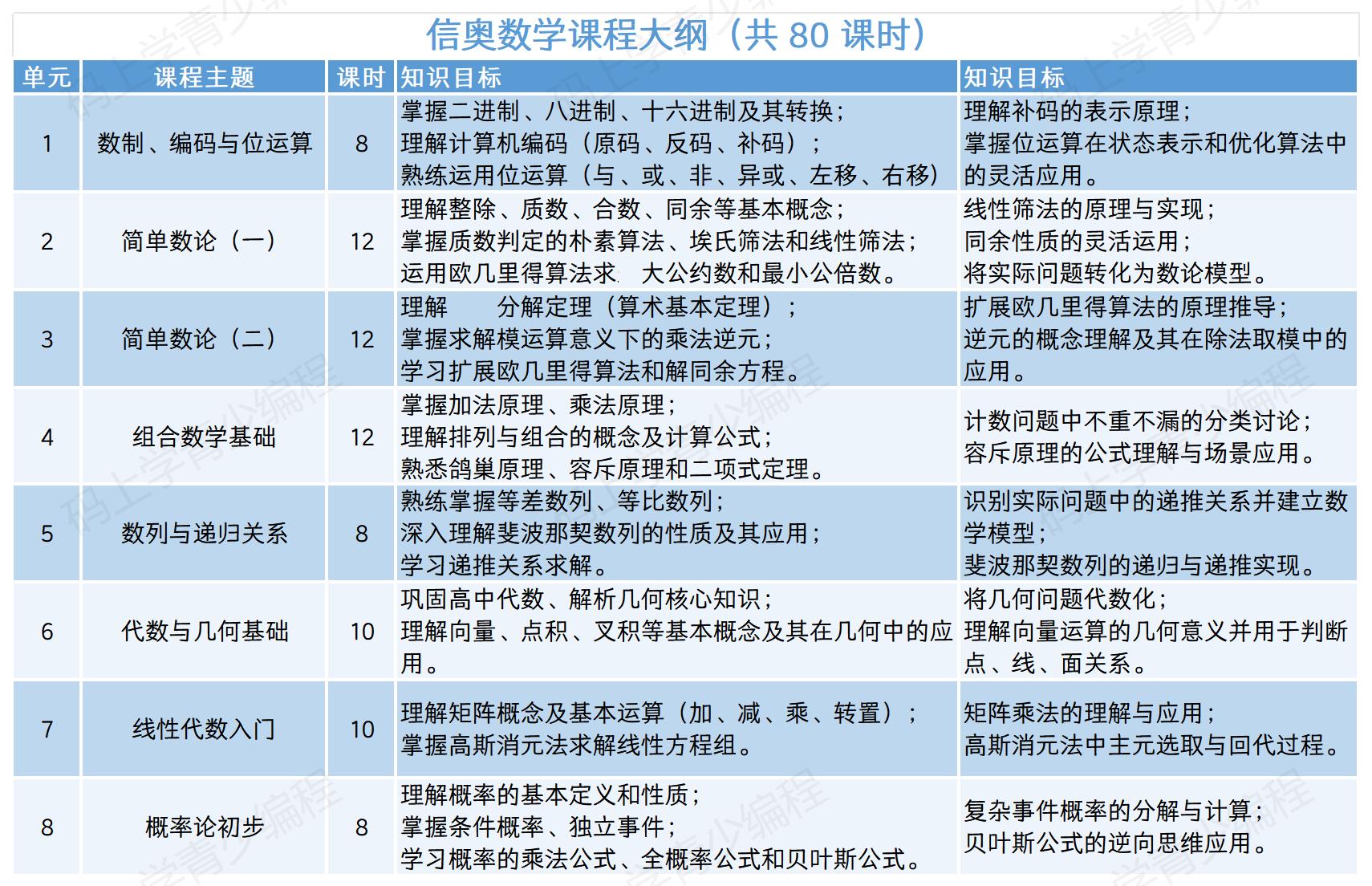 本课程共80课时,涵盖八大单元:数制与位运算、简单数论(24课时)、组合数学、数列与递归、代数几何、线性代数及概率论。课程聚焦编程竞赛核心数学知识,旨在提升学员的算法思维与问题解决能力。