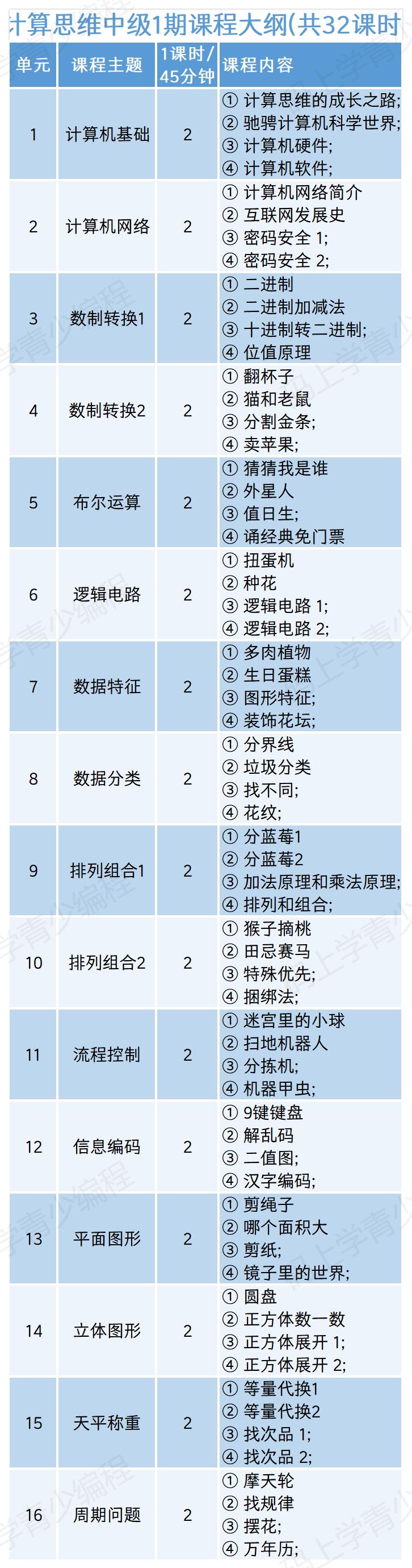 计算思维中级课程分三期,每期32课时。内容涵盖计算机基础、算法(如排序、搜索、动态规划)、数据结构(树、图)、逻辑推理等,培养问题解决和编程思维。
