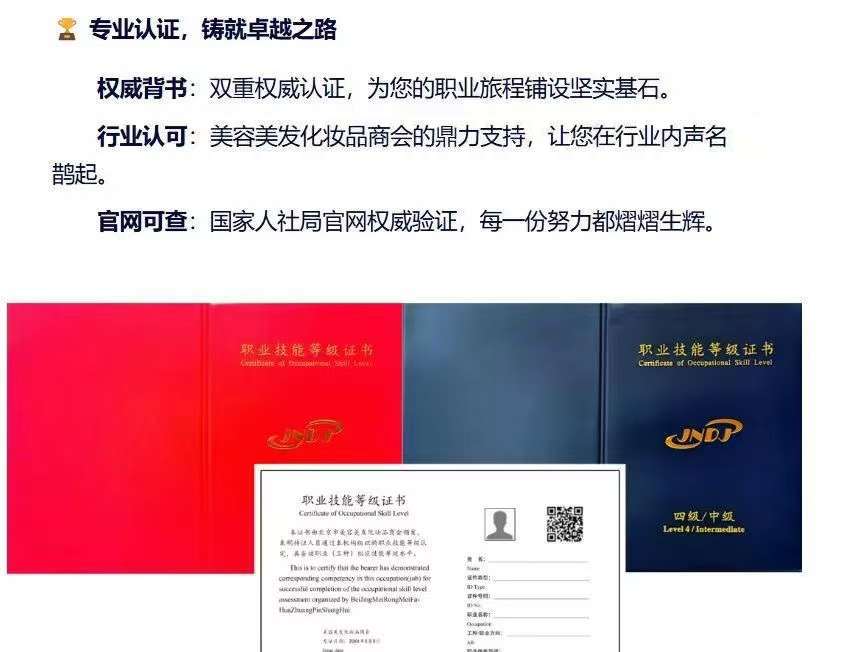 形象设计师职业资格证书是由中华人民共和国人力资源和社会保障部北京市人力资源和社会保障局颁发和认可的专业证书。通过该职业资格证书的认证,你将成为形象设计领域中的佼佼者,拥有出色的技能和专业知识无论是对形象的整体规划,还是对衣着、妆容、发型等细节的把握,你都将具备独到的见解和非凡的才华。北京市美容美发化妆品商会是北京市唯--家获得颁发此证的机构。