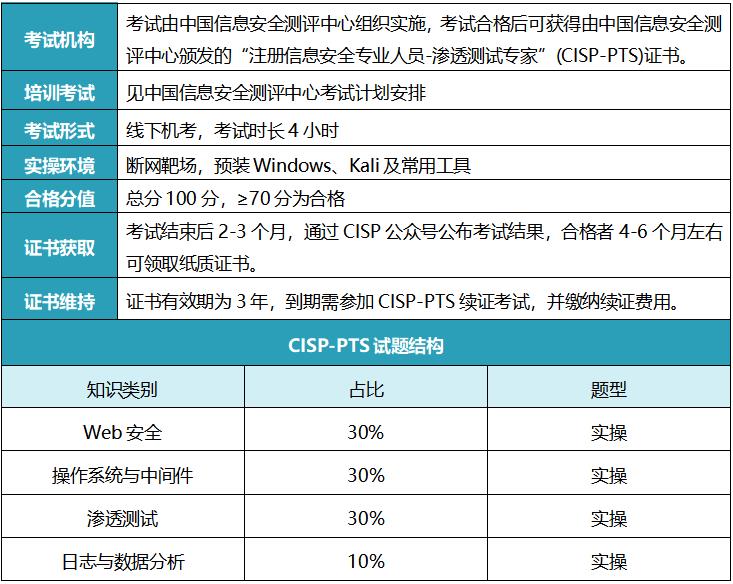 CISP-PTS注册信息安全专业人员-渗透测试专家由中国信息安全测评中心颁发,是国内渗透测试领域认可度极高的国家 级认证。面向网络安全攻防场景,聚焦锻炼从业者实际解决网络安全问题的能力,证书持有者需具备漏洞研究、代码分析、各类攻击技术运用及网络安全解决方案策划能力,是政府、国企及重点行业渗透测试岗位从业,企业获取信息安全服务资质、参与网络安全项目的核心凭证。