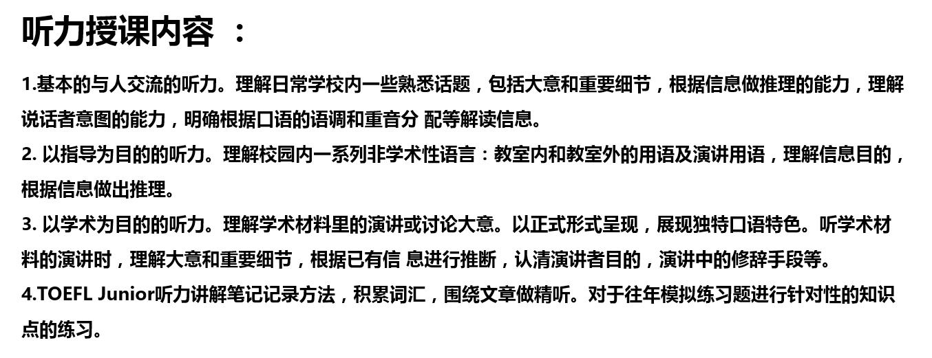 2.以指导为目的的听力。理解校园内一系列非学术性语言:教室内和教室外的用语及演讲用语,理解信息目的,根据信息做出推理。