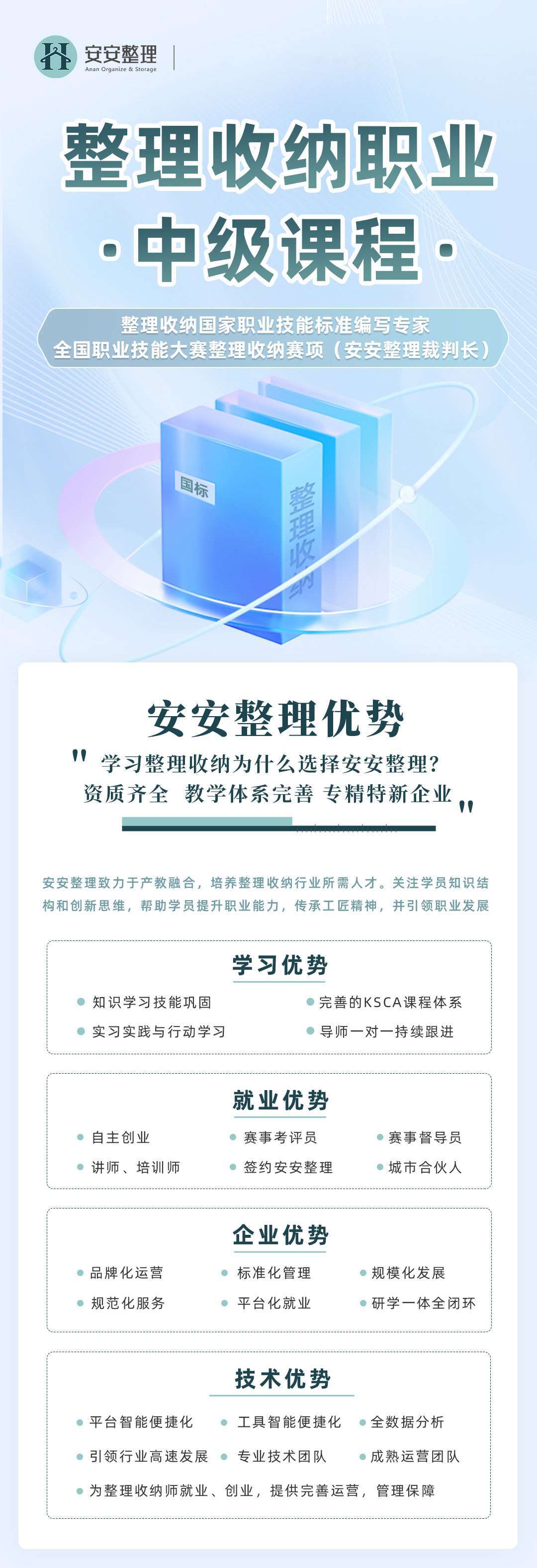 安安整理致力于产教融合,培养整理收纳行业所需人才。关注学员知识结构和创新思维,帮助学员提升职业能力,传承工匠精神,并引领职业发展