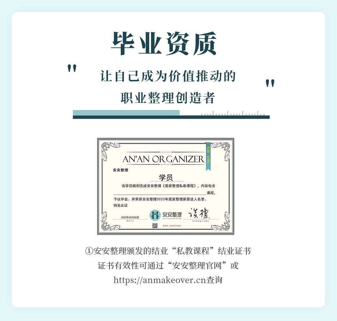 安安整理品牌在短短几年间,一跃成为国内整理收纳行业的头部企业,奠定整理收纳规范技能课程与服务标准流程,参与制定及主编国家《整理收纳师国家职业技能标准》,是全国商贸服务业职业技能等级评价规范 《整理收纳师》的编写专家、《全国新职业和数字技术技能大赛》裁判长与专家组组长,全面推进了整理收纳行业的发展。