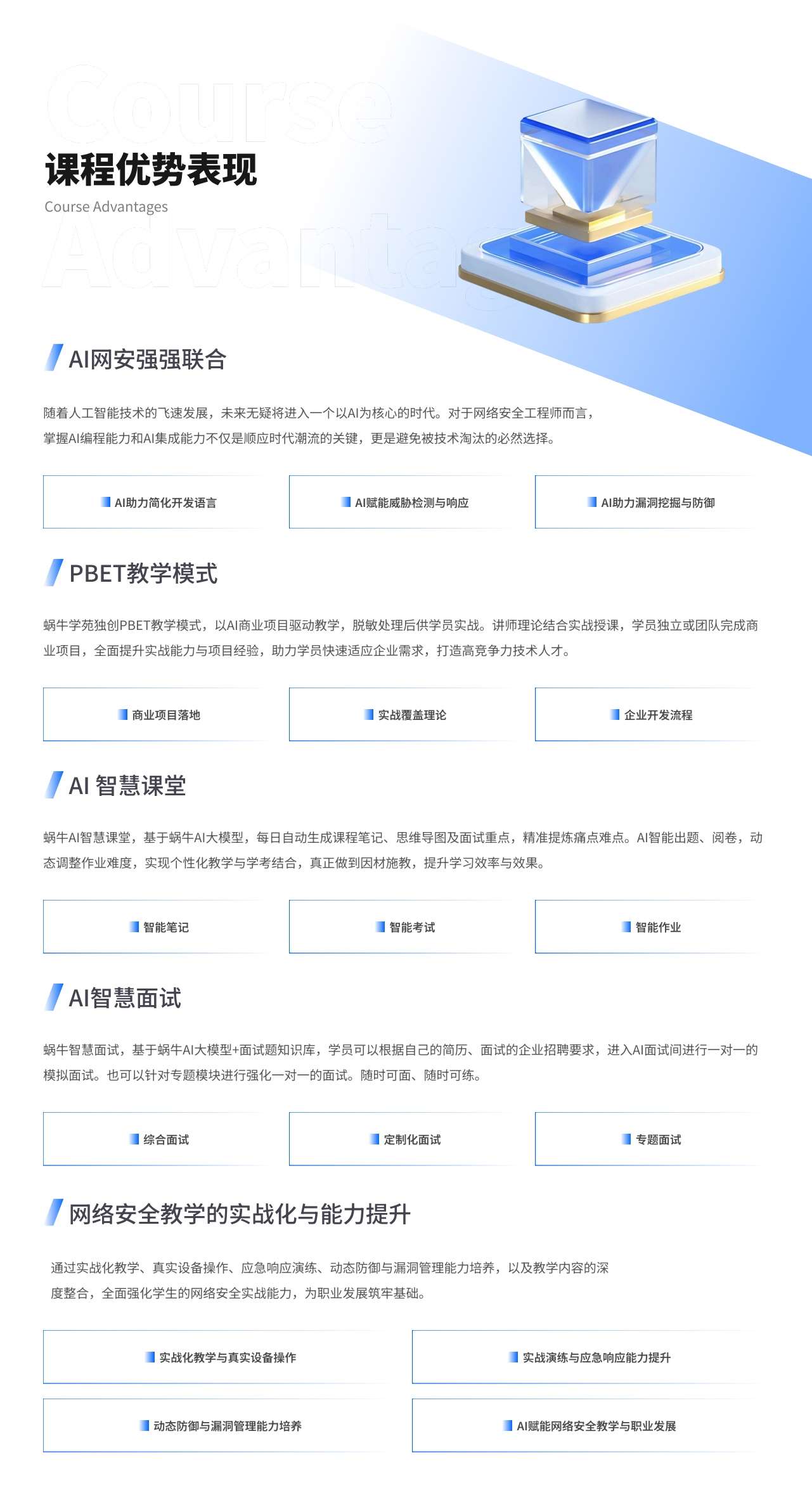 蜗牛学苑全新10.0课程体系均融入AI技术,并结合AI智慧课堂、AI面试官、AI在线教育平台,更加聚焦个性化教学,提升学员学习质量和业务能力,助力学员高薪就业。