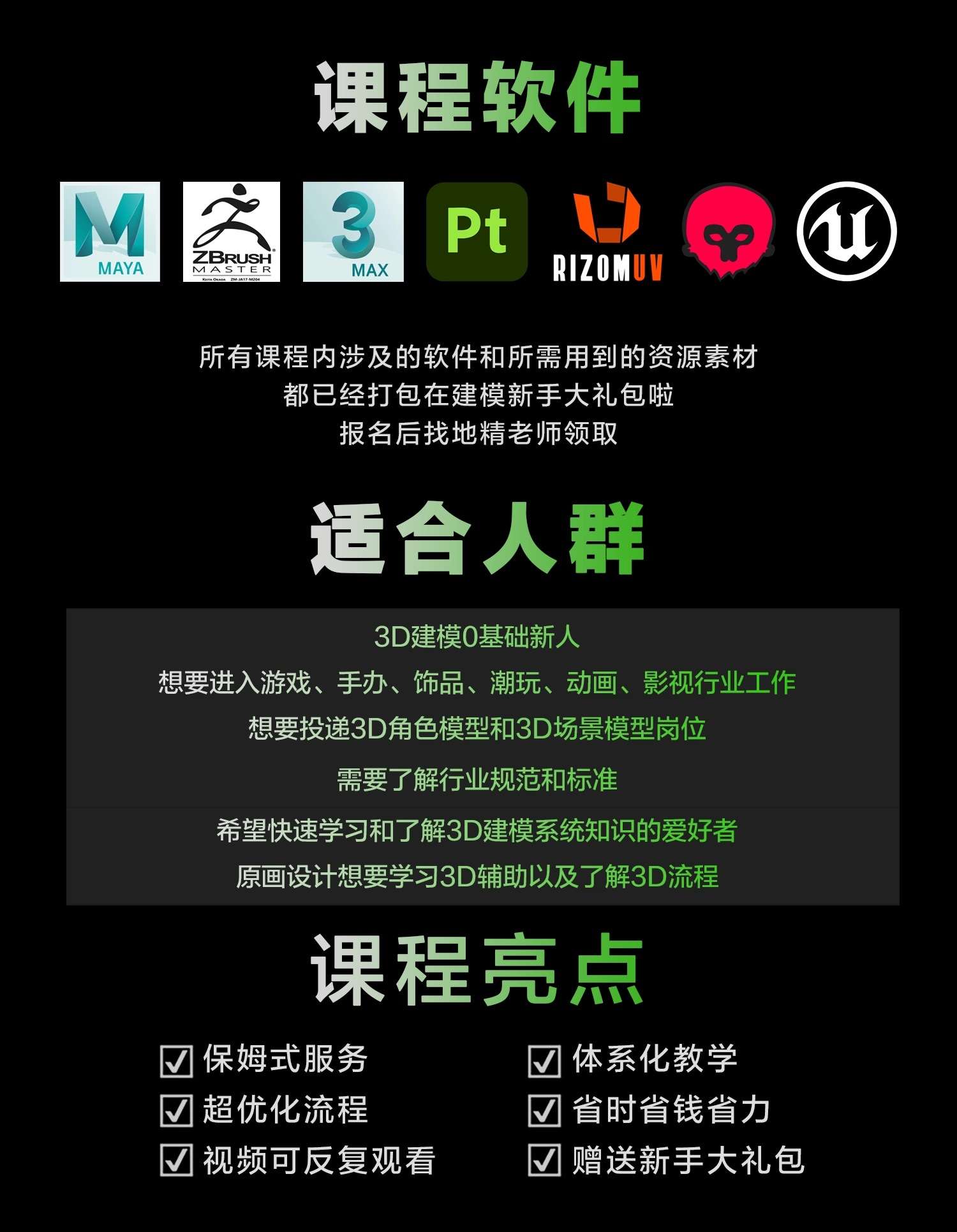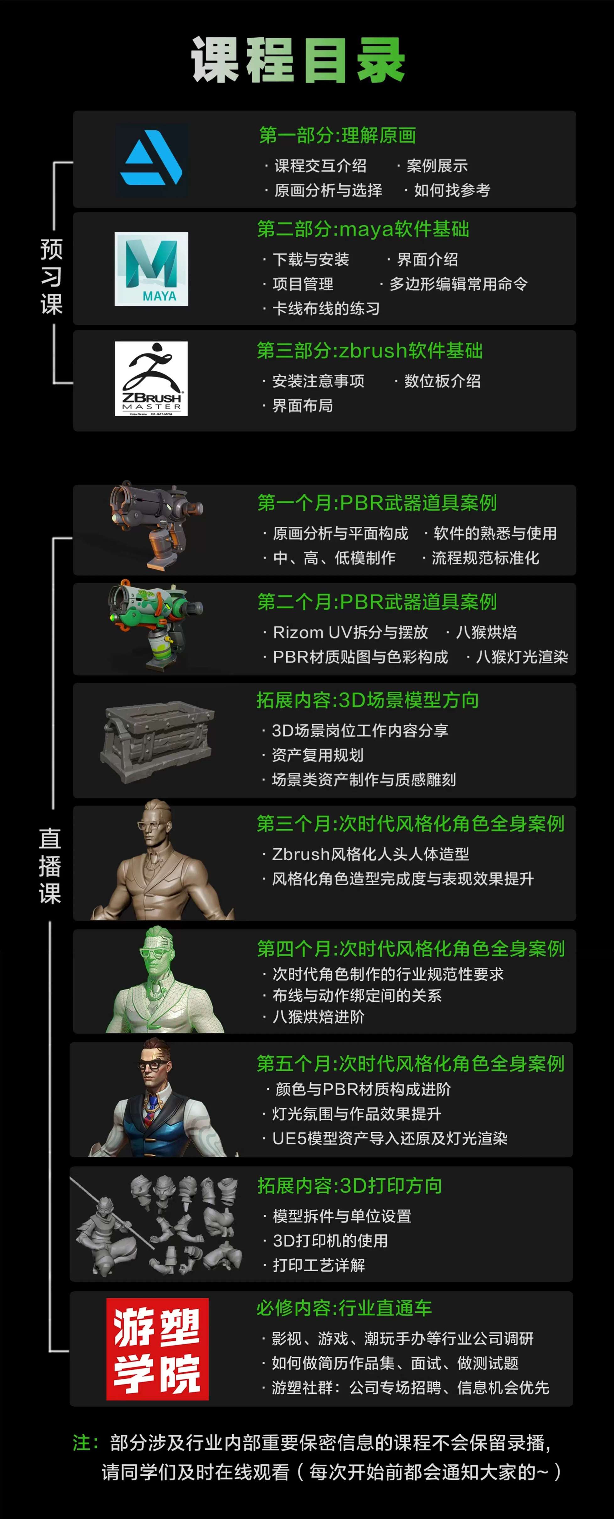 我们一直专注于游戏动漫、手办潮玩、影视动画行业的人才培养,以贴近实际项目工作的内容来教学,为行业培养了非常多的优秀人才。学院目前围绕3d建模领域,开设网络课程及线下课程两种模式,课程涵盖角色与场景两大方向,线上班包括:3D角色就业班、3D场景资产班、3D建模基础班、Nomad手办班、人头人体造型进阶班等专业课程。2025年,游塑学院线下校区在重庆永川正式落地,适合新人小白的线下角色班在2025年5月正式开启,未来还将推出线下场景资产班,3D特效班等。