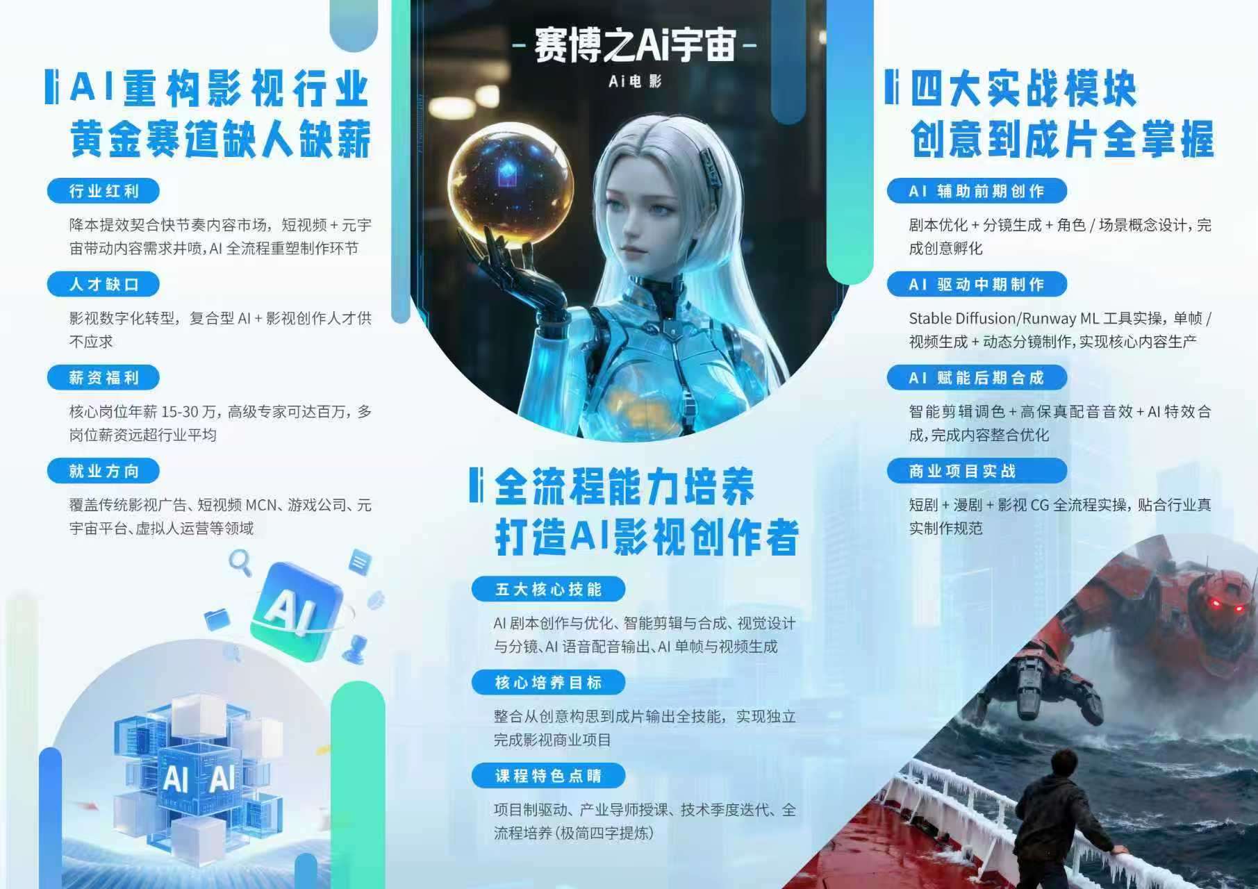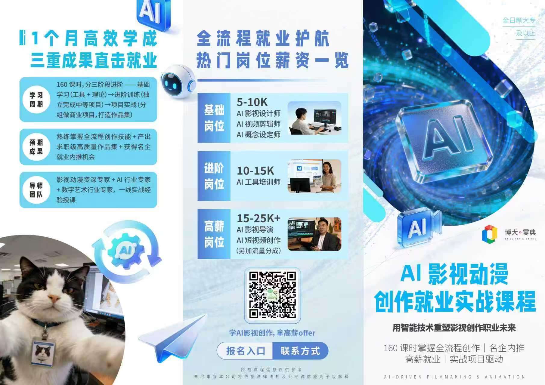 1 个月 160 课时高强度实战,一线专家授课,内容随 AI 技术同步更新;以商业项目驱动学习,覆盖前期到后期全环节,提供一站式就业护航,助力快速上岗。