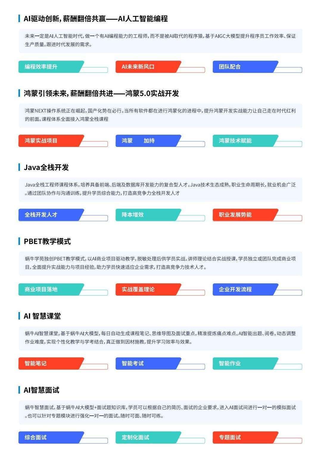 蜗牛学苑全新10.0课程体系均融入AI技术,并结合AI智慧课堂、AI面试官、AI在线教育平台,更加聚焦个性化教学,提升学员学习质量和业务能力,助力学员高薪就业。