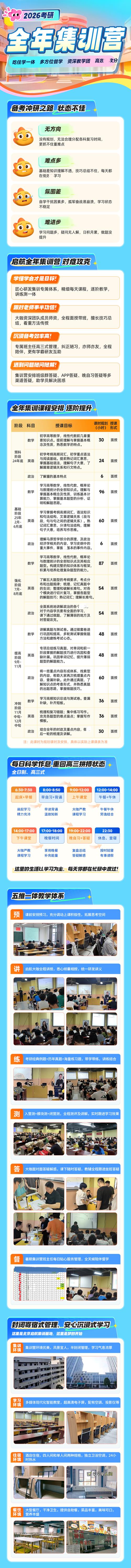 26考研全年集训营,匠心研发集训专属课程体系,5大教学阶段,逐阶教学提升,科学规划,讲练测结合,沉浸式备考高效提升,全职教辅老师随问随答,3v1师资全程督学伴学。