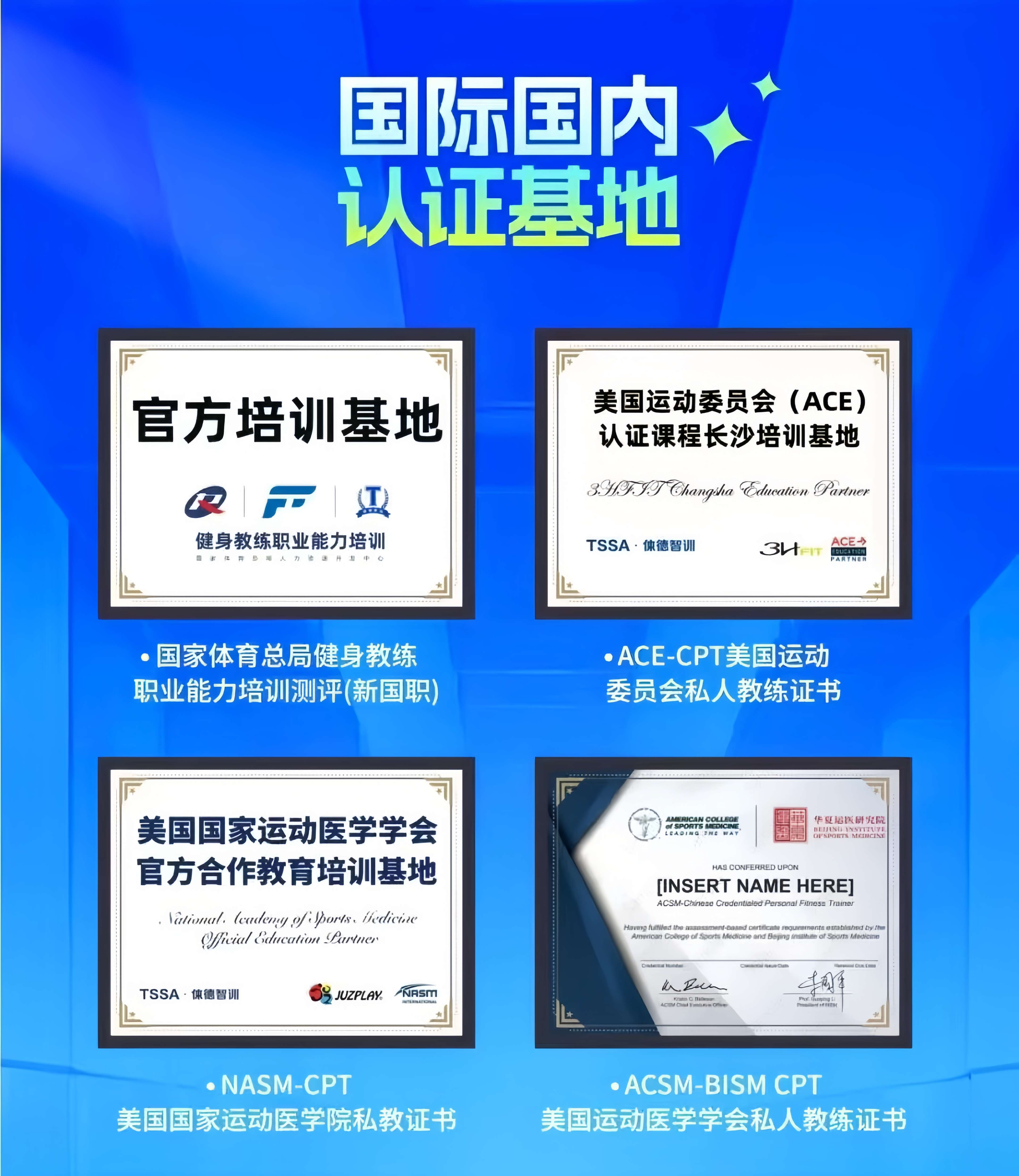 同时是国家体育总局人力资源开发中心、NASM(美国国家运动医学院)、ACE(美国运动委员会)、ACSM(美国运动医学学会)的官方认证课程培训及考核基地。