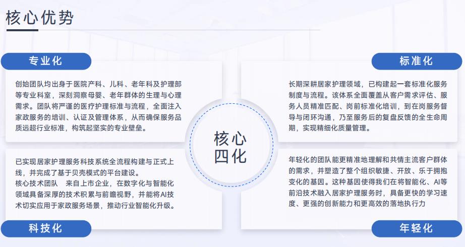 公司通过先进标准化管理,为客户提供诚信、便捷、有保障、高品质的居家护理服务。与 30 多家职业培训学校达成校企融合,10000 多位持证专业服务人员随时待命,30 多位医疗专家提供后援支持。基于家庭服务大数据,整合服务资源,提供全方位、多保障的管家式服务,力争成为全国前沿的居家护理服务平台,以 “让家充满爱” 为使命。