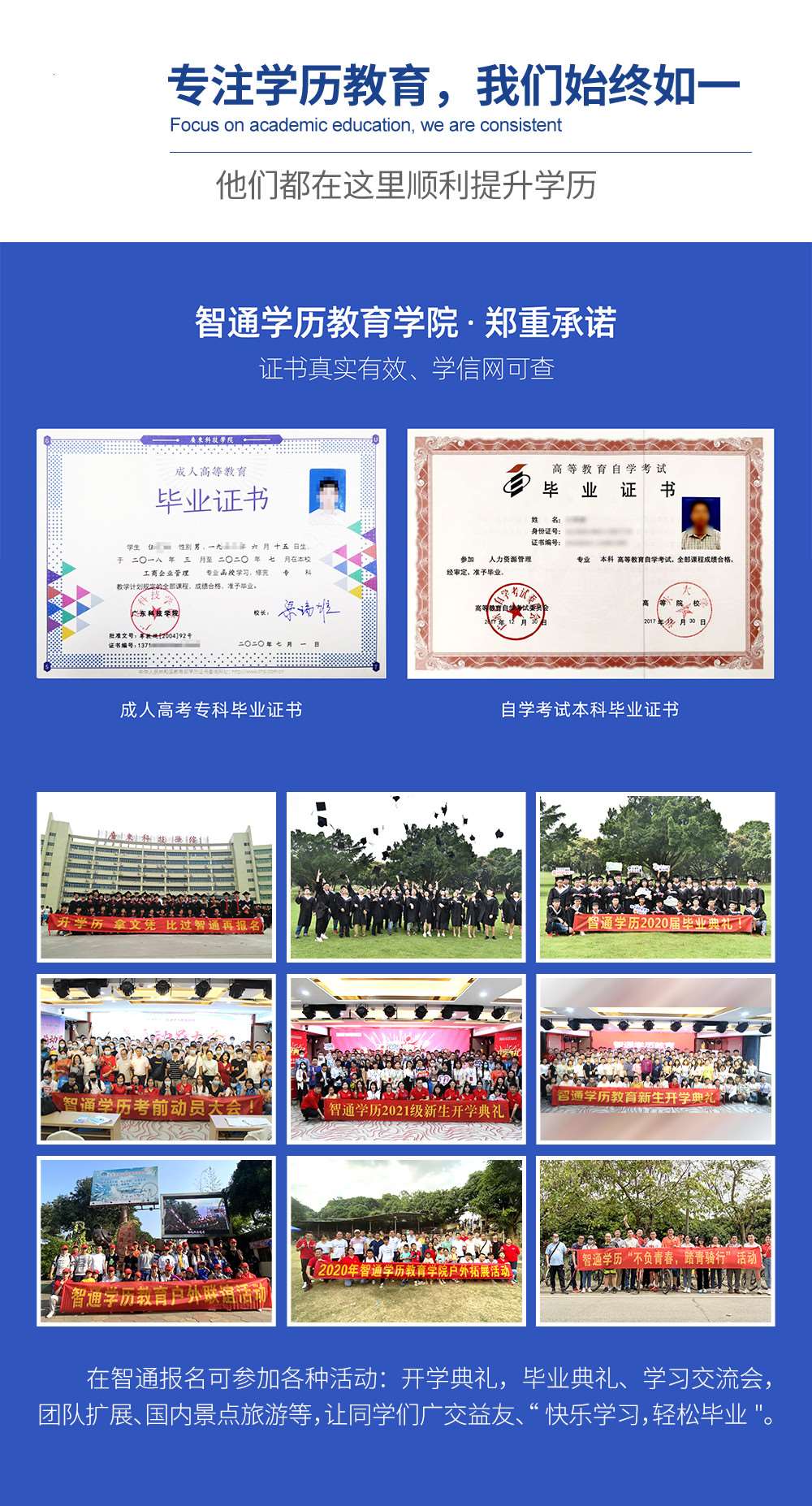 广东智通职业培训学院(智通培训)是经广东省人力资源与社会保障厅批准创办,由广东智通人才连锁集团投资成立,集技工技能、资格认证、学历教育和企业培训四大核心项目于一体的综合性培训机构。依托优质的师资团队、智通集团强大的就业渠道以及创业孵化平台资源,为学员提供全方位的培训、就业、创业一站式服务。智通学历莞城分校创立至今,已为上万家用人单位和近万学员提供了多种形式的学历提升服务。从培训规模、教学质量、考试通 过 率等各方面均处于华南地区领 先地位。现已在莞城、长安、塘、等地设立了多家分校因此荣获中国优秀成人培训机构等数十项各级荣誉称号。