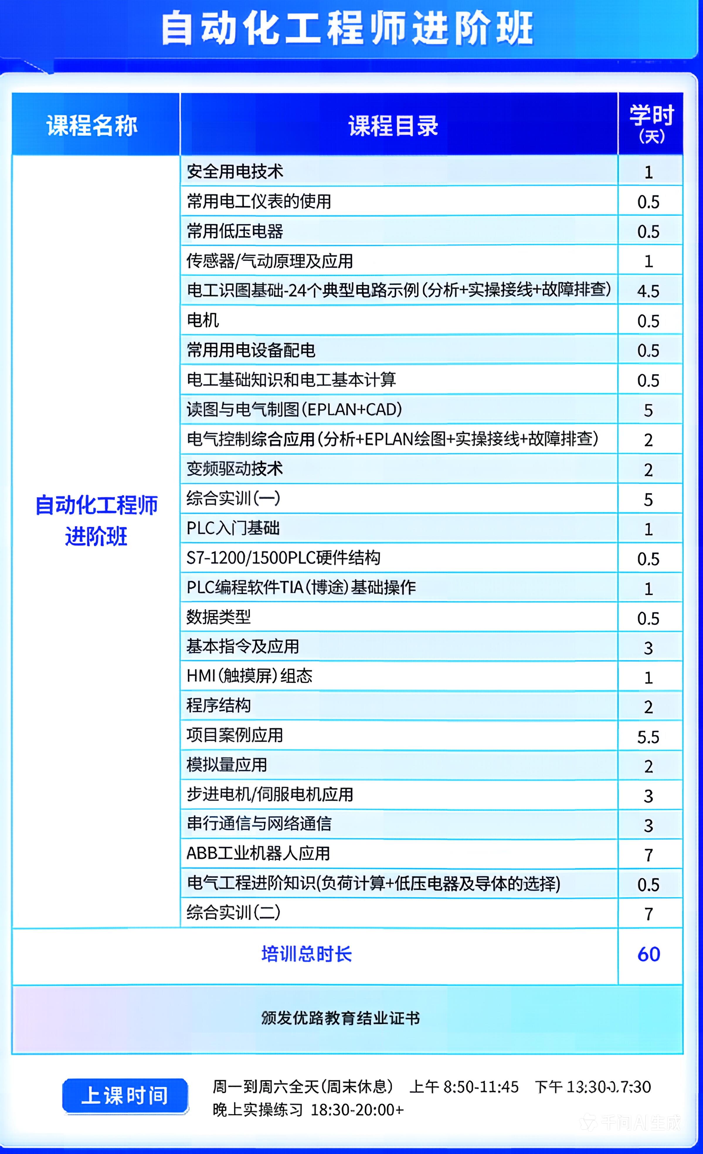 自动化工程师进阶班主要学习内容:常用低压电器(原理/读图/选型/接线);识读PLC程序;编写常规PLC程序;故障排查;中等控制柜配盘;ABB机器人基本操作; 综合实训(一);综合实训(二)
