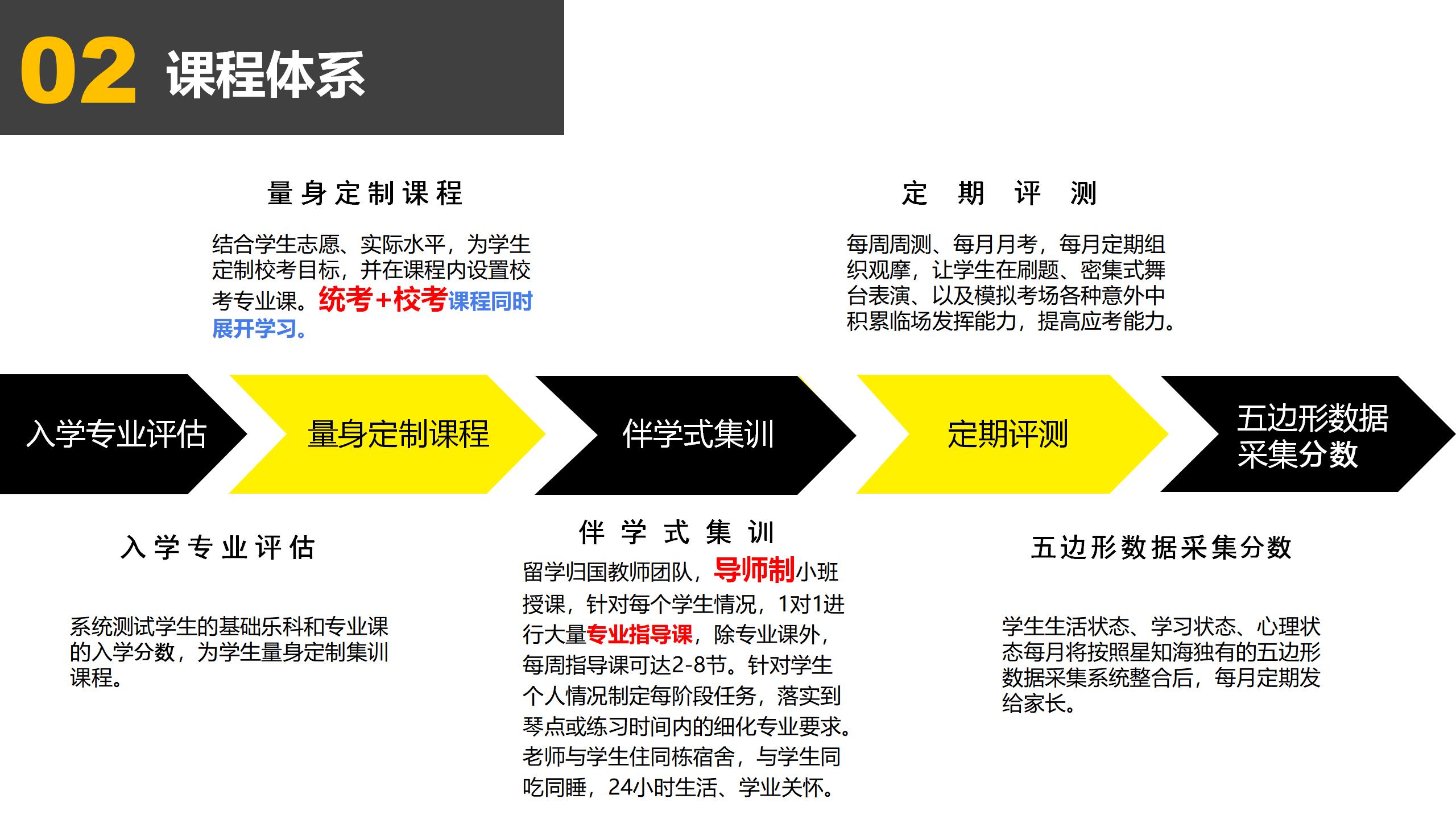 系统测试学生的基础乐科和专业课的入学*,为学生量身定制集训课程。有意向报名本科及重本的学生须通过评估标准方可报名。
