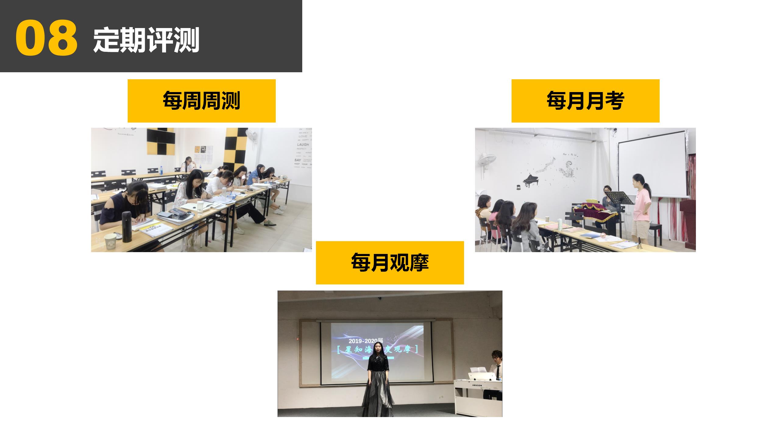 每周周测、每月月考,每月定期组织观摩,让学生在刷题、密集式舞台表演、以及模拟考场各种意外中积累临场发挥能力,提高应考能力。