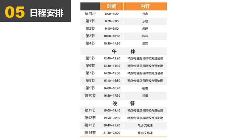 留学归国教师团队,导师制小班授课,针对每个学生情况,1对1大量专业指导课,除专业课外,每周指导课可达2-8节。针对学生个人情况制定每阶段任务,落实到琴点或练习时间内的细化专业要求。老师与学生住同栋宿舍,与学生同吃同睡,24小时生活、学业关怀。