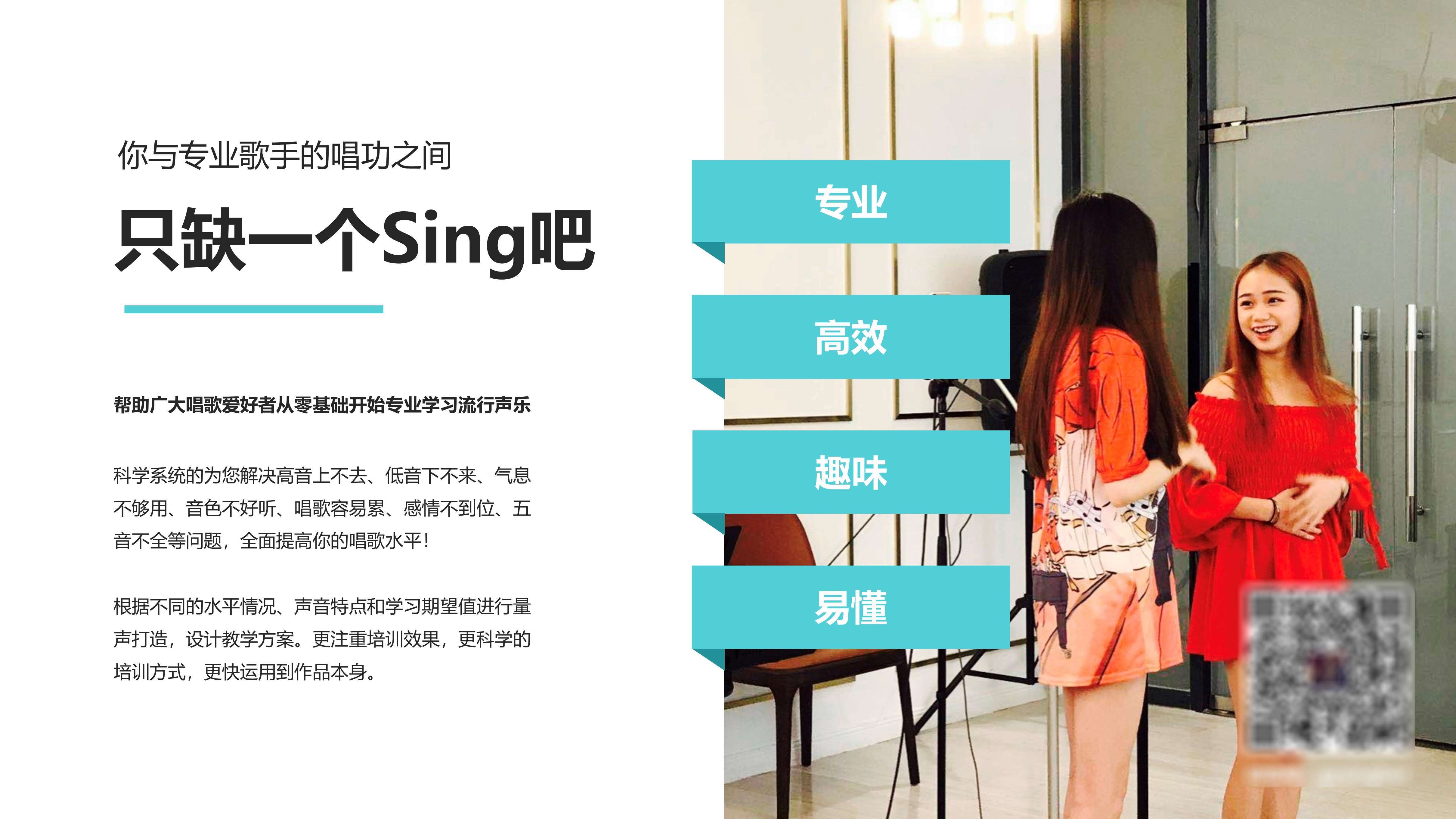 机构简介:Sing吧品牌,创立于2008年,多位艺人讲师与唱吧红人联合举办,十年磨一剑,专注流行唱法培训,帮助数千位学员提升声乐技巧,学员分别在酒吧、校园巡回演出、文化传播公司、广告公司、互联网直播平台、各大赛事中等取得好*!师资力量强大,导师团队由星海、央音、沈音、武音、上音、川音、华师、英皇、Hartford哈特音乐学院等国内外著名音乐院校学士、硕士组成。有丰富教学经验和教学成果、扎实和过硬的专业知识、出色的授课技巧,能快速准确地发现学员问题,并制定有效的教学方案。帮助广大唱歌爱好者从零基础开始专业学习流行声乐,科学系统的为您解决高音上不去、低音下不来、气息不够用、音色不好听、唱歌容易累、感情不到位、五音不全等问题,全面提高您的唱歌水平!