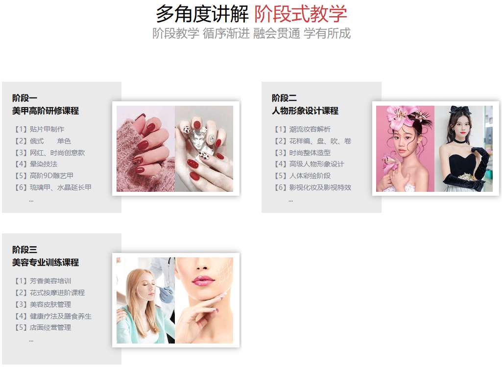 本课程是组合定制课程,课程涵盖化妆、美容、美甲三个专业,通过掌握不同化妆造型设计规范,学习时尚美容技术和形象设计的专业技能和生活美甲技术,全方位发展,培养能适应社会发展需要和职业岗位需求德智体美全面发展的应用型人才。