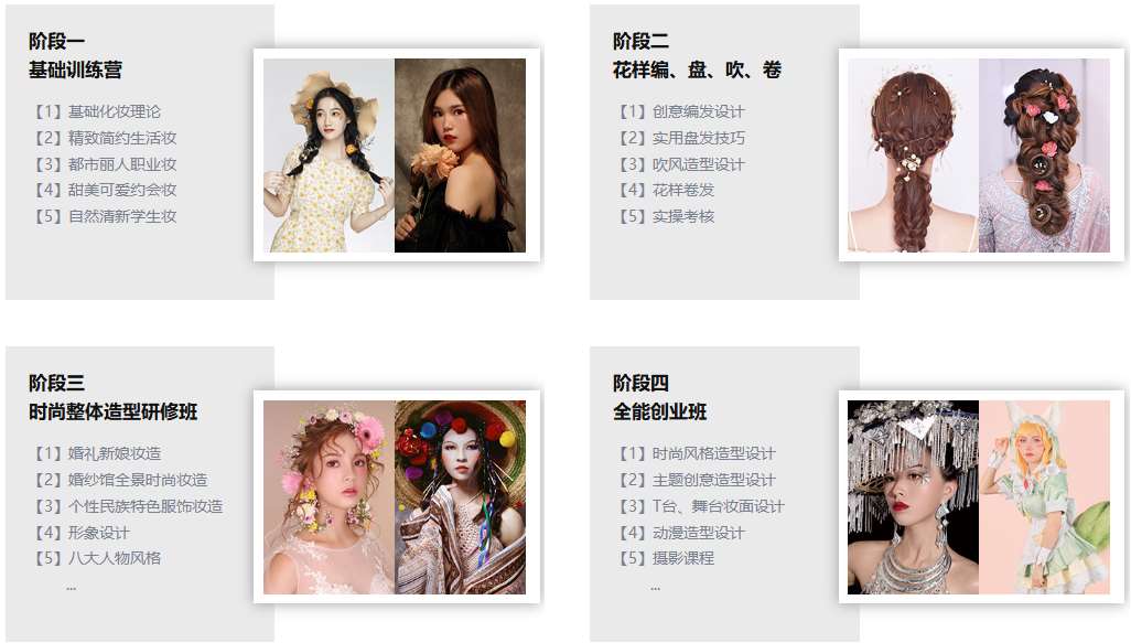 百美汇明星课程,系统教学专业化妆美学知识,让学生掌握在不同场合条件下各类专业化妆造型设计规律,课程内容突出实用型、应用性以及艺术创意设计能力,通过系统知识的学习,培养实用型与艺术型相结合的化妆造型设计技能应用人才。