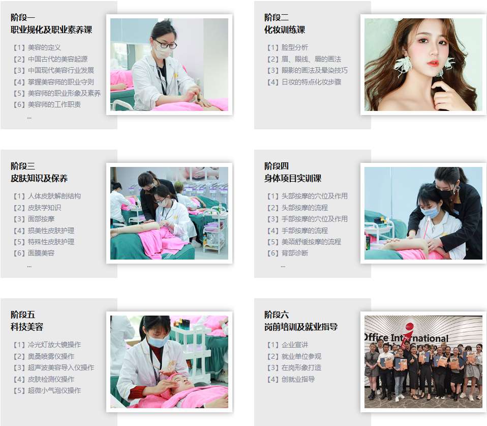 通过专业理论教学使学员掌握与美容技能,美容服务,通过专业技能培训,使学生熟练全套美容美体服务,及美容院常见的修饰美容、仪器护肤等技能、达到基本独立上岗的水平。