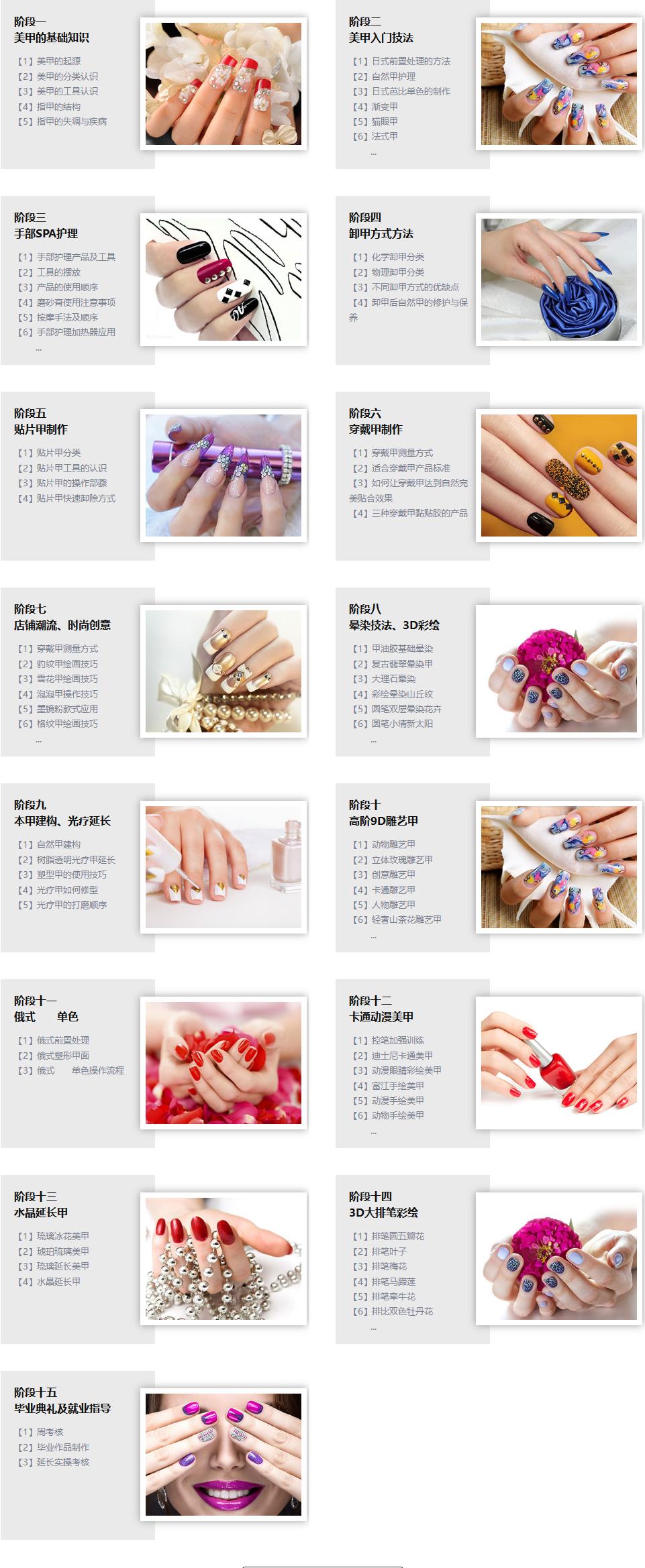 培养出综合能力强,职业修养全面,且具备全面美甲技能及店面管理销售的全能型美业人才,使学员不仅具有熟练专业的美甲知识及技能,同时培养具有专业知识全面以及熟悉时尚潮流、审美,能够独立完成各种美甲工作的资深美甲师。