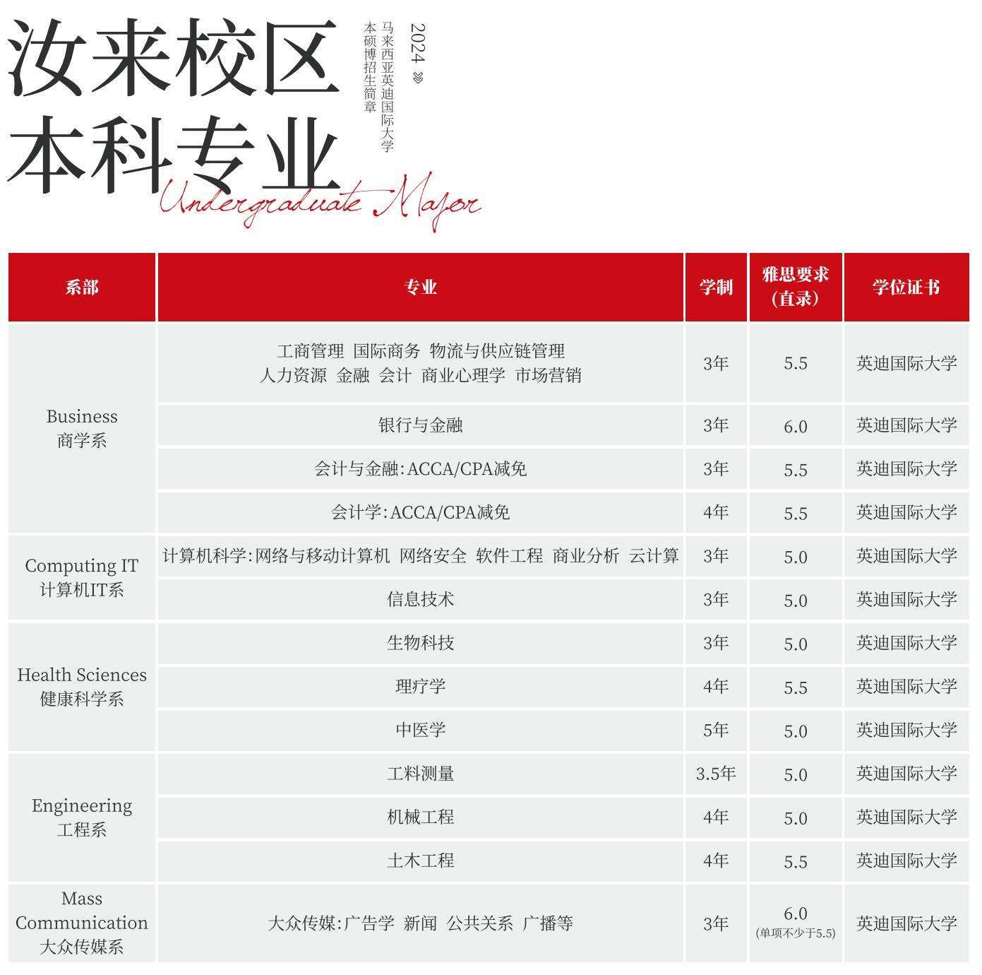 英迪国际大学提供本科、硕士和博士等多个层次的教育。与来自美国、加拿大、英国、澳大利亚等20多个国家的200多所著名大学合作开展学分转移及联办课程,学生在英迪国际大学学习期间有机会获得英国、澳大利亚、美国等国家200多所大学的本科和硕士学位,这些学位受到全球认可。英迪国际大学的专业涵盖商科、计算机、工程、医学、心理学、教育学、大众传媒、艺术设计等多个领域。