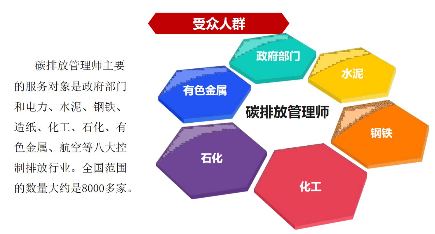 碳排放管理师主要的服务对象是政府部门和电力、水泥、钢铁、造纸、化工、石化、有色金属、航空等八大控制排放行业。全国范围的数量大约是8000多家。