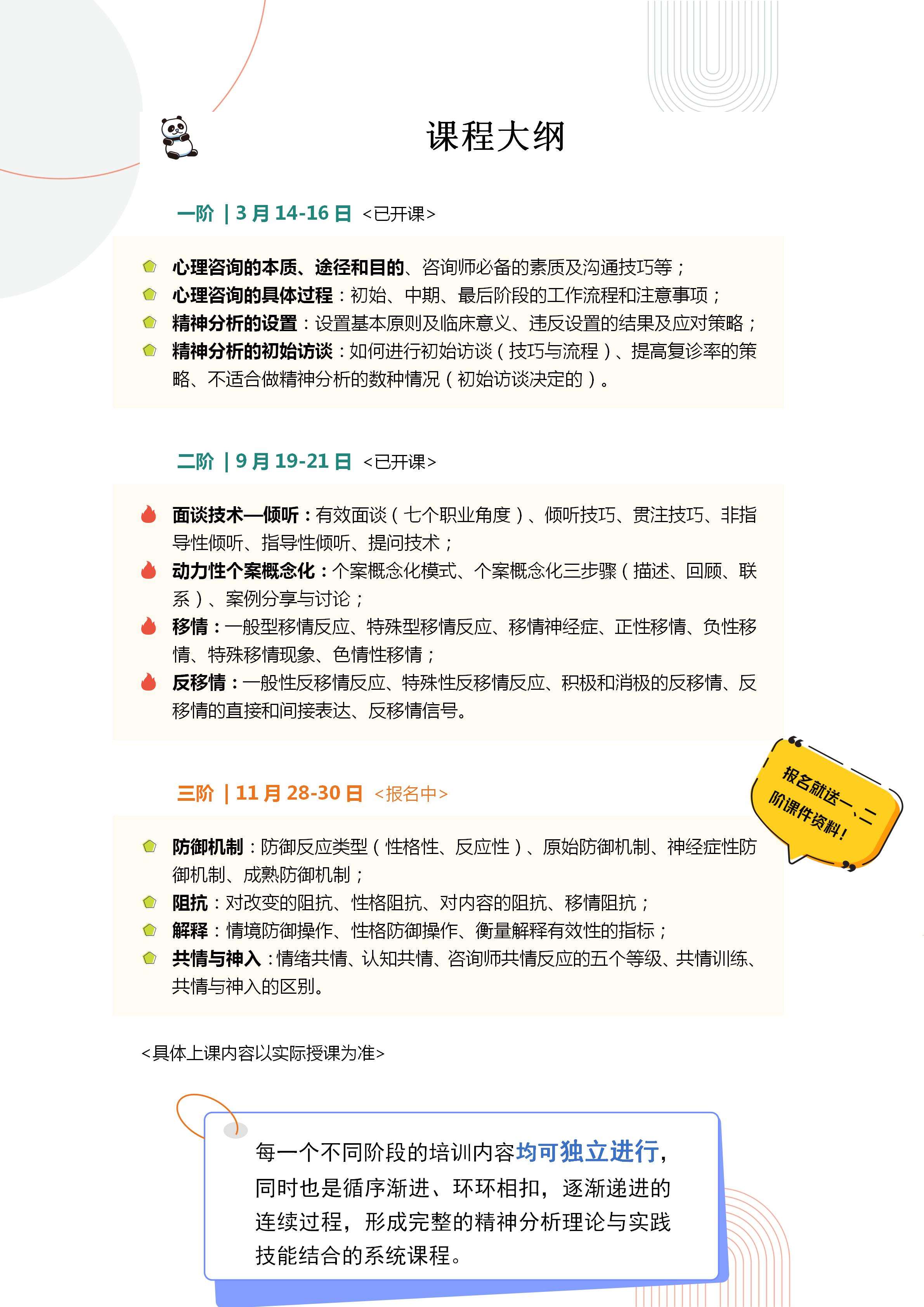 为此我们为你精心打造了一个这样的系统课程——《心理咨询师入门成长课》,为你开启专业咨询的大门,全面系统的连续性地面课程设置,行业大咖手把手教你如何做咨询。