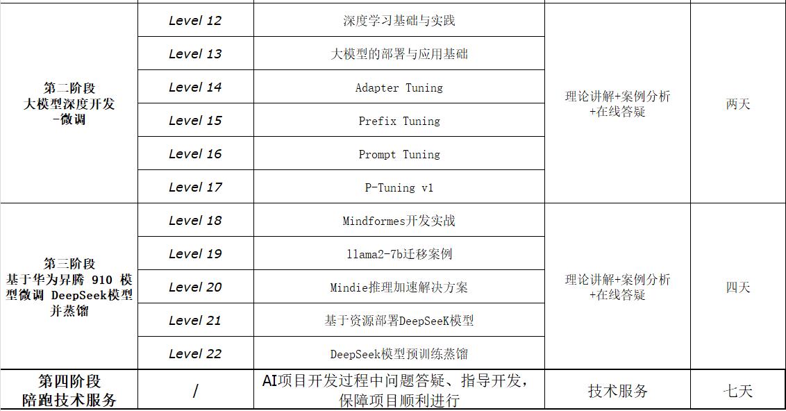 培养昇腾芯片算法开发人员, 学员可以胜任昇腾环境下大模型训练、微调、蒸馏等大模型项目核心任务。