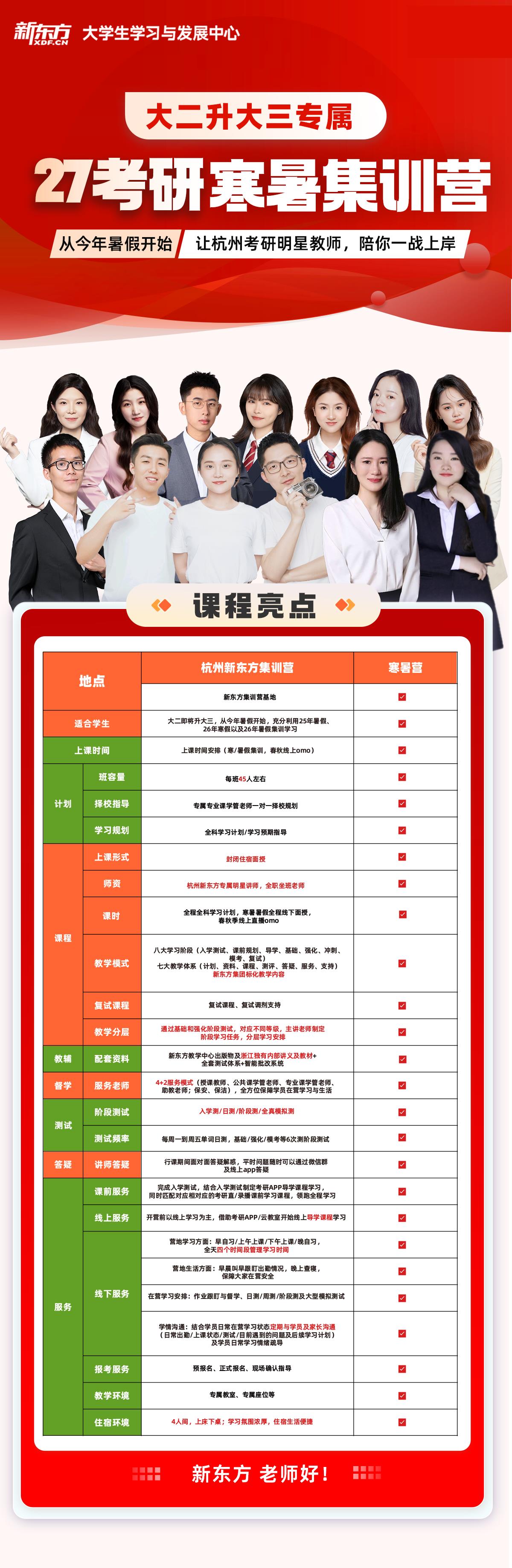 机构简介:新东方教育科技集团定位于以学生全面成长为核心,以科技为驱动力的综合性教育集团。作为中国著名私立教育机构,新东方教育科技集团于2006年9月7日在美国纽约证券交易所成功上市,2020年11月9日在香港联合交易所成功二次上市。截至2021年2月28日,新东方已经在全国104个城市设立了118所校区、11家书店以及1625家学习中心,拥有超过48300名教师,累计面授学员超6490万人次。新东方大学生学习与发展中心,是新东方教育科技集团旗下的大学教育品牌,依托于新东方的教学沉淀和丰富的教育资源,为中国3800多万大学生提供系统化学习解决方案和就业指导;杭州新东方成立于2005年7月21日。作为北京新东方教育科技集团在浙江的一级分校,校区倚重集团十八年成功的办学经验和强大的师资力量,秉承新东方集团"一切为学生着想,一切以质量取胜"的办学宗旨,以先进的教学理念、独特的教学模式、良好的教学设施成为浙江教育培训业的重要力量。校区开设包括少儿英语、少儿全科、中学英语、中学全科、大学英语、考研全科、成人英语、出国考试培训、公务员考试培训等众多课程,并提供专业的国际游学和出国咨询服务。成立六年来开设班级数千个,培训学员近20万人次。