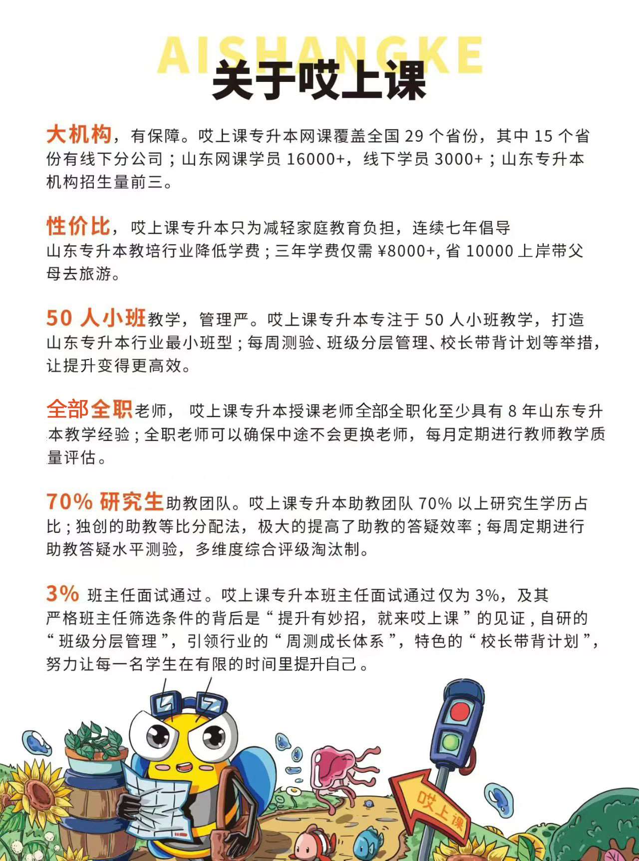 大机构,有保障。哎上课专升本网课覆盖全国29个省份,其中15个省份有线下分公司;山东网课学员16000+,线下学员3000+;山东专升本机构招生量前三。