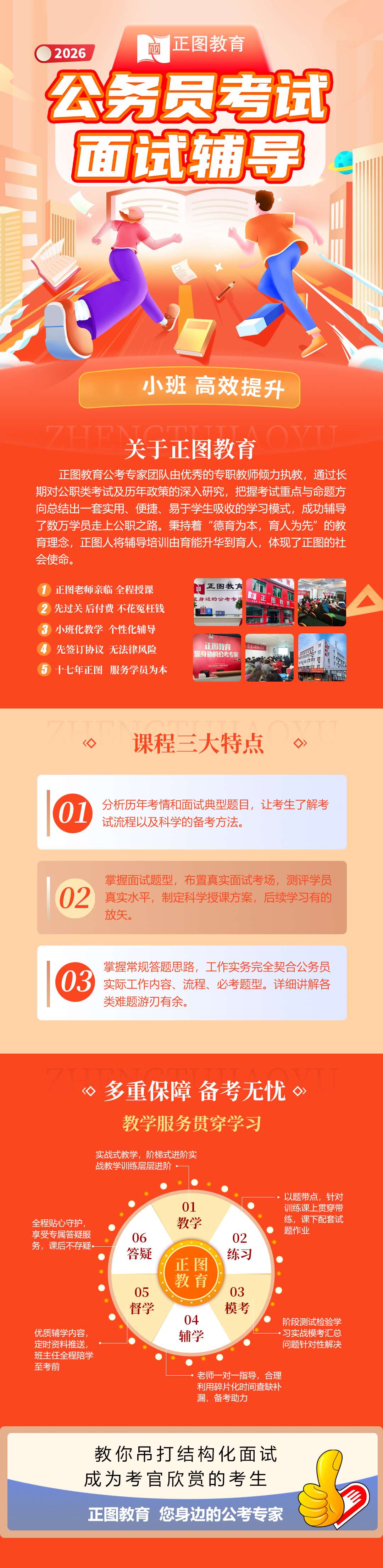 机构简介:◇正图介绍正图教育是由中和(北京)智力技术研究院创办的公职类考试辅导品牌;主要经营项目有国家公务员、地方公务员、事业单位、招警、选调生、教师招聘、村官、三支一扶、信用社、银行系统、军转干、遴选等十余类考试的笔试及面试的面授辅导培训。正图教育专家团队由优秀的专职教师倾力执教,通过长期对公务员考试及历年政策的深入研究,把握考试重点与命题方向,总结出一套实用、便捷、易于学生吸收的学习模式,成功辅导了数万学员走上公务员之路。目前培训学校和学习中心已遍布全国20多个省市及自治区。公职类教辅图书、音像资料已经面市,网络直播课堂、网校等产品也已经全面上线。◇正图文化正图教育秉承“做良心企业,行良知服务”的办学理念,坚持以服务学员为根本,以保证质量教学为核心,以创建高效优质的学习体系为动力,致力于帮助考生走上“公务正途”。◇通过情况正图教育所有班均为小班授课,有利于老师及时了解学员个人能力特征,把握每个学员的学习状况并进行针对性的辅导,老师能够全面照顾每一位考生,师资团队强大,从专项精讲到技巧提高到刷题强化到临考冲刺,多轮循环,逐轮提升,阶段模考,专项测评、针对性全面提升;综合通过较高。◇正图优势师资优势:正图教育旗下拥有一支专业的师资团队,所有讲师都是其研究院签约的公考辅导专家,对于公职考试有着深入研究并积累了丰富的教学经验。为确保教学质量、树立良好的品牌形象,正图教育教研中心所分派到各分校的教师都是高级别讲师,授课经验均五年以上,做到对每个考生负责。品牌优势:正图教育由指南针教育集团创办,指南针集团是在创办于1993年的原交大考研辅导班和新尚教育中心合并的基础上于2002年正式成立,作为大型教育培训机构,集团有着二十多年的办学经验;正图公考作为大型教育培训机构,每年都有数万学子在正图参加考试培训。产品优势:正图公考依托中和智力研究院和正图公考研究院强大的研发实力,不断更新培训课程体系,保障教学的高品质。正图教育五大教学保障和六大教学体系,科学有效辅导学员高分通过;小班化教学,笔试分阶段循环授课,讲练结合、高效针对性辅导!面试个性化培训,讲师全程授课,全方位指导与点评;听课不满意,全额退还;过关才是硬道理!服务优势:第1,与其他机构相比,正图在提供较长课时的同时能够保证价格相对较低,对于考生来说性价比更高。第2,正图是小班化、分阶段教学,课程阶段之间模考讲评,检验学习效果的同时为讲师针对性授课提供依据,教师可根据学员的基础与接受能力调整讲课速度,同时与学员一对一交流的时间更长,保障正图每一位学员都能全面提升。第3,开班期间设有晚自习,有老师及工作人员的陪同与指导,巩固学员白天所学内容,保证学习质量。这里我们郑重承诺先过关后付费!◇教学理念“德育为本,育人为先”的教育理念,正图人将辅导培训由育能升华到育人,体现了正图的社会使命。中和智力研究院强势的研发实力和上律指南针成熟的教学管理经验为正图教育的发展提供了强有力的保证。通过科学化、人性化、个性化的教学方式将公职培训与育能、育人有机结合,不仅提高了学生的个人能力,而且能够结合自身的兴趣、个人特长,正确规划职业人生。正图给予学生的不仅仅是能力和素质的全面提高,更有一个美好的未来!企业精神:笃学慎思 严谨创新以教育培养能力,因能力超越自我,秉承教育推动社会进步的使命;我们以成为您身边的公考专家而自豪.