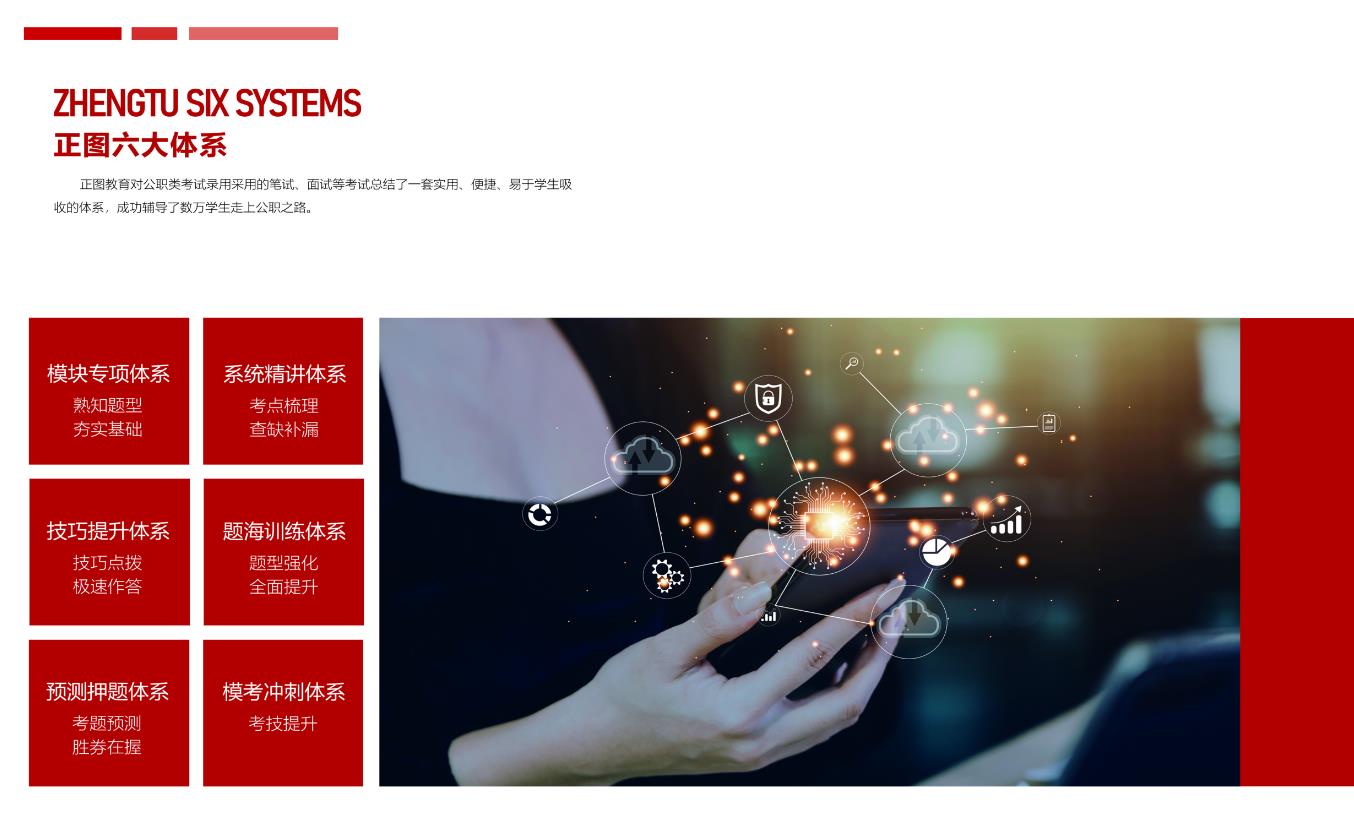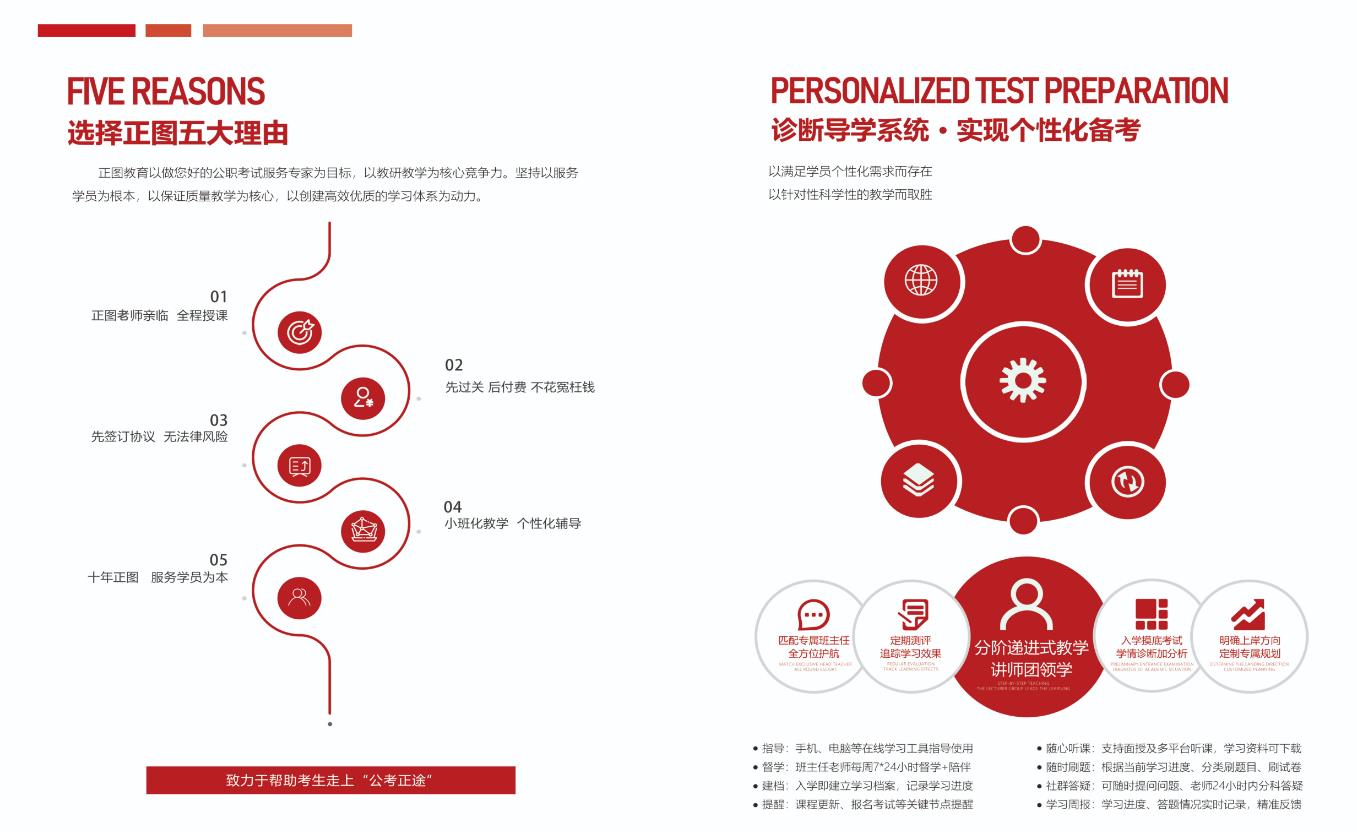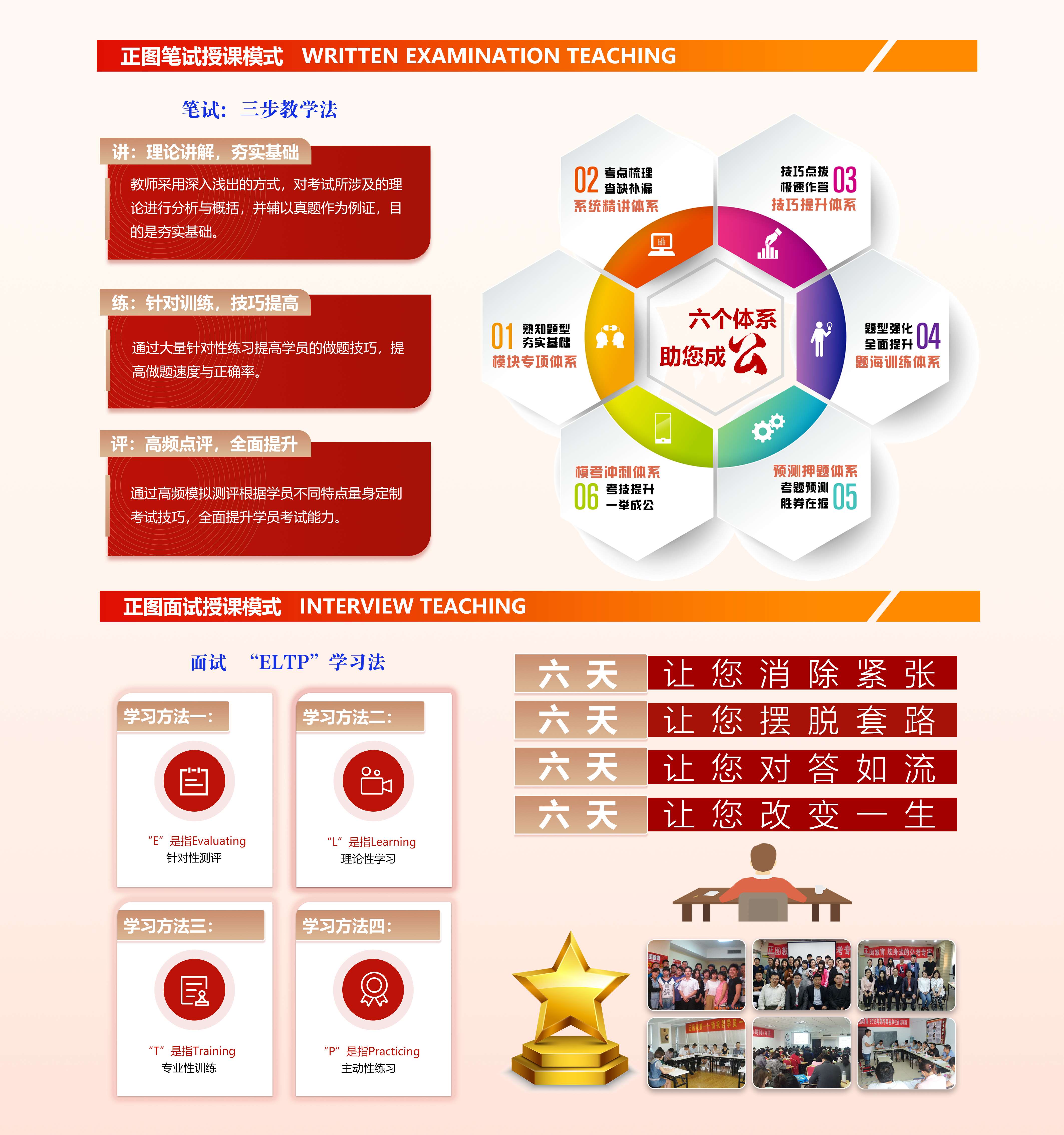 产品优势:正图公考依托中和智力研究院和正图公考研究院强大的研发实力,不断更新培训课程体系,保障教学的高品质。正图教育五大教学保障和六大教学体系,科学有效辅导学员高分通过;小班化教学,笔试分阶段循环授课,讲练结合、高效针对性辅导!面试个性化培训,讲师全程授课,全方位指导与点评;听课不满意,全额退还;过关才是硬道理!