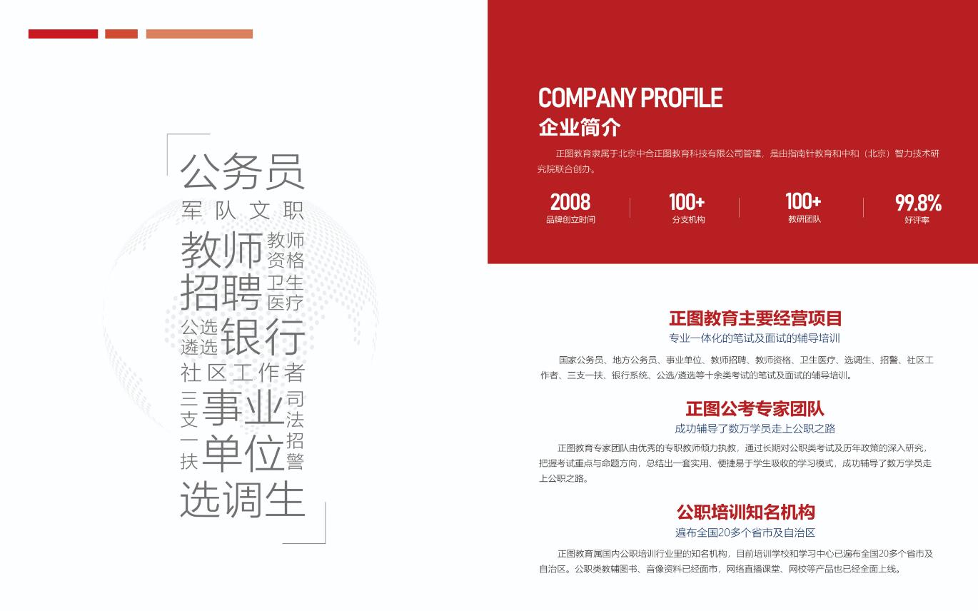 正图教育是由中和(北京)智力技术研究院创办的公职类考试辅导品牌;主要经营项目有国家公务员、地方公务员、事业单位、招警、选调生、教师招聘、村官、三支一扶、信用社、银行系统、军转干、遴选等十余类考试的笔试及面试的面授辅导培训。