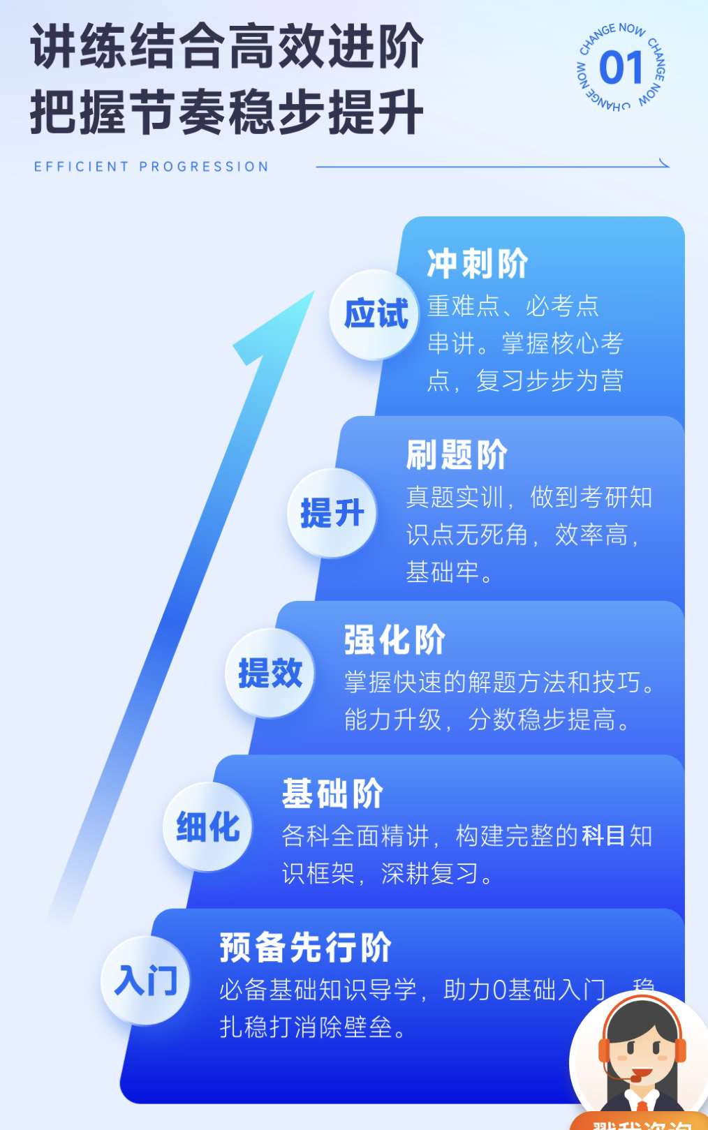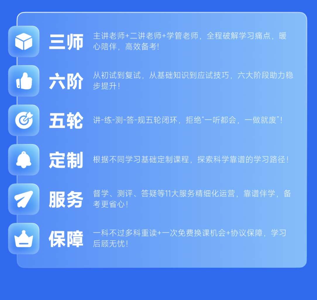 六阶:从初试到复试,从基础知识到应试技巧,六大阶段主力稳步提升!