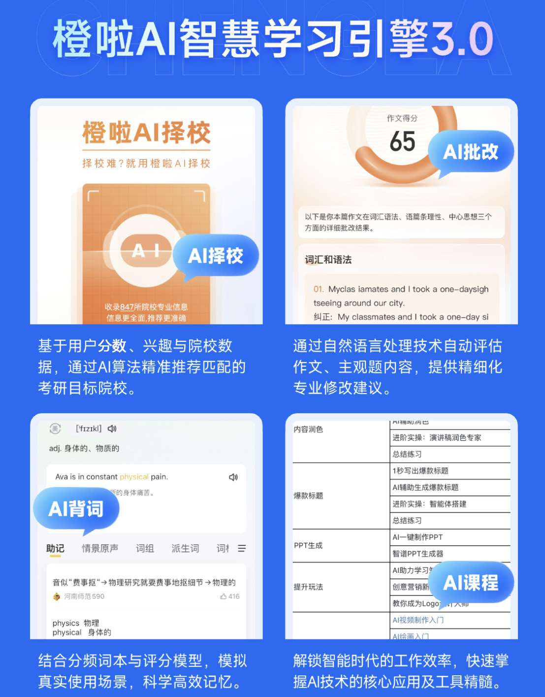 机构简介:橙啦是由张爱志于 2018 年 3 月 18 日创立的新一代互联网教育创新服务平台,业务全面覆盖考研、考公、四六级、留学、雅思、成人英语、家庭教育等方向,目前已处于在线职业教育第1梯队 。 橙啦致力于成为年轻人信赖的学习与成长平台,全职员工超 1000 人,硕博比例超过 30%,其听课学员累计已经超过 1600 万人,遍布全球 160 个国家和地区。橙啦师资队伍强大,其团队汇聚了来自清华、北大、中科院、北航等院校毕业的人才。其旗下各业务板块都有独特的课程体系,如橙啦考研采用五轮六阶,SPA 全科全程一站式上岸体系,橙啦公考根据学员学习规律,建立了五环五阶成长体系等。平台拥有智能学习系统,其 SPA 智能 AI 团队能在学员入学择校、上课、练习等各个环节提供智能支持。橙啦还推出四对一个性化服务,由学管师、政治助教、英语助教、数学助教全程指导。同时还构建了班级管理体系、24H 答疑及全真模考体系等六大服务体系。受到了更多年轻人的青睐。
