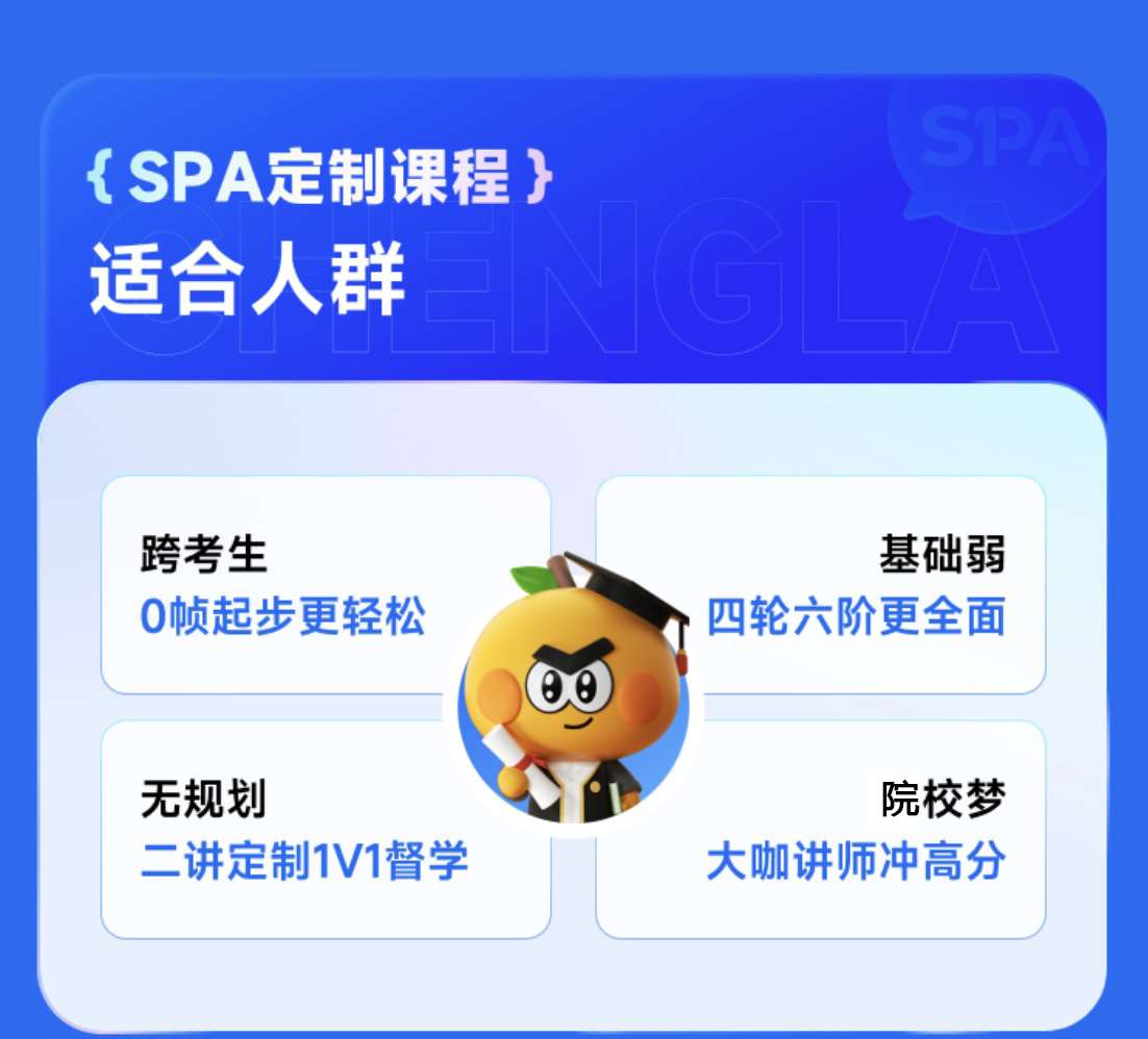 机构简介:橙啦是由张爱志于 2018 年 3 月 18 日创立的新一代互联网教育创新服务平台,业务全面覆盖考研、考公、四六级、留学、雅思、成人英语、家庭教育等方向,目前已处于在线职业教育第1梯队 。 橙啦致力于成为年轻人信赖的学习与成长平台,全职员工超 1000 人,硕博比例超过 30%,其听课学员累计已经超过 1600 万人,遍布全球 160 个国家和地区。橙啦师资队伍强大,其团队汇聚了来自清华、北大、中科院、北航等院校毕业的人才。其旗下各业务板块都有独特的课程体系,如橙啦考研采用五轮六阶,SPA 全科全程一站式上岸体系,橙啦公考根据学员学习规律,建立了五环五阶成长体系等。平台拥有智能学习系统,其 SPA 智能 AI 团队能在学员入学择校、上课、练习等各个环节提供智能支持。橙啦还推出四对一个性化服务,由学管师、政治助教、英语助教、数学助教全程指导。同时还构建了班级管理体系、24H 答疑及全真模考体系等六大服务体系。受到了更多年轻人的青睐。
