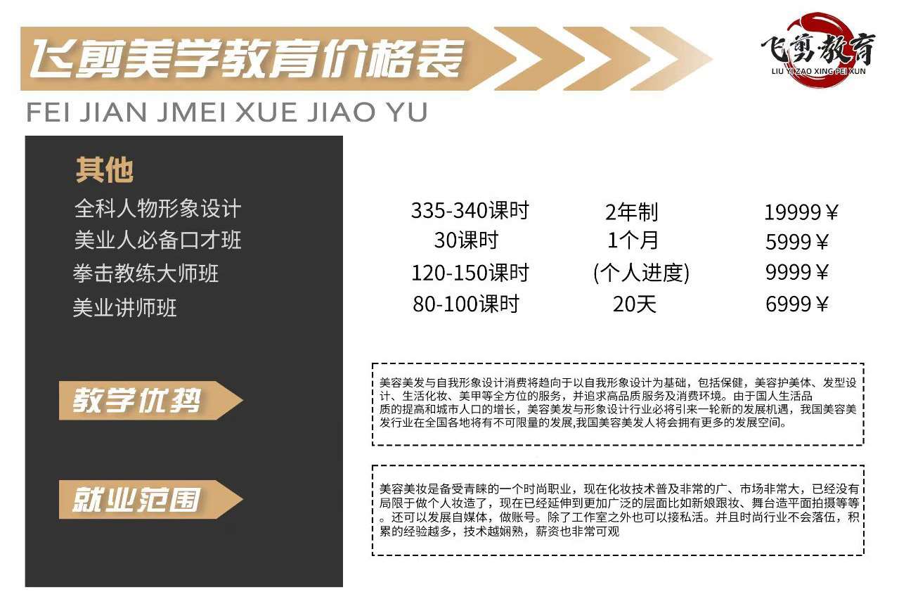 机构简介:济南飞剪美业培训是一所美容、美发、化妆、美甲、美睫纹绣等美妆类型综合项目。济南飞剪美业培训教学设施完善,老师团队28多人,教学态度严谨,每年为社会输送数千名优秀学员,经过多年的发展,学校积极参与社区等团体组织的公益活动,定期为福利院,老人理发,学校致力于拓展学员的综合素质,让学员在学校学到真正的技术,而且在社会上也更容易争取到机会学校优势专业优势:能娴熟地根据顾客需求来进行形象设计服务。掌握各年龄段主流造型设计及养护与化妆造型技能,为市场和社会输送化妆与美发造型服饰搭配,整体搭配设计等专门人才。管理管理优势:全封闭式管理,规范化作息与高强度训练,采用半军事化管理,确保学生在校安全,使孩子自立自强,学有所成。教学优势:·精品教研团队\实力教学·一对一辅导\高质量教学·全方位系统\针对性课程.专业性师资力量就业优势:我校各专业就业单位全国分配,就业安置灵活,根据学生实际情况提前提供就业实习机会,争取让孩子早就业早赚钱。学校始终坚持成就更多家人就业创业梦想。我们“以人为本,关爱学生;因材施教,力求完美”。我校坚持以不断超越、精益求精的品质来发掘和创造化妆造型、美甲美睫、美容美体、美发摄影 形象设计口才演讲的千姿百态和无限魅力。同时,学校正以滴滴心血培养学子,造就时尚美业万千人才,以强势蓬勃和绵延不息的力量活跃在艺术造型舞台上,向社会大众表现美、传播美、创造美。目前,除山东学员以外,学校面向全国招收来自各地的学员。发展规划:济南飞剪美业培训 LIUYI FEIJIAN ZHIYEPEIXUN济南飞剪美业培训的宗旨是:加快发展山东教育培训业,弘扬中华民族美业文化,推动教育培训行业诚信体系建设,提高行业技术水平,提升学校美誉度和社会影响力。根据宗旨的思路指导,主要展开以下工作:学校将以教学服务为重点,宣传推广,相互交流和提升整合为要点,引导美业教育行业有序发展,肩负起企业效益与社会效益双重责任。(一)开展学校发展调研,开展学校人员培训和管理经验交流。开展化妆造型,美甲美睫美容美体,摄影美发,色彩搭配和形象设计等专项课程的人员培训和经验交流活动,促进教学管理现代化规范化发展。(二)开展学校教学人员的技术、技能水平评比和技术交流。开展教学技能评比交流活动,促进技艺水平不断提高,激励涌现更多优秀的专业人才。(三)制定美妆美发教育行业行规并组织实施。建立完善的美妆教育行业自律性管理约束机制维护钻研进取的教育教学氛围。为社会行业提供建议:承办有关教学条件、技术评估等项目。(四)评选奖励优秀的老师和学员。由学校牵头,每年举办美妆教育行业从业人员的评选和颁奖鼓励更多从业人员不断提高自身的综合素质和技能水平。