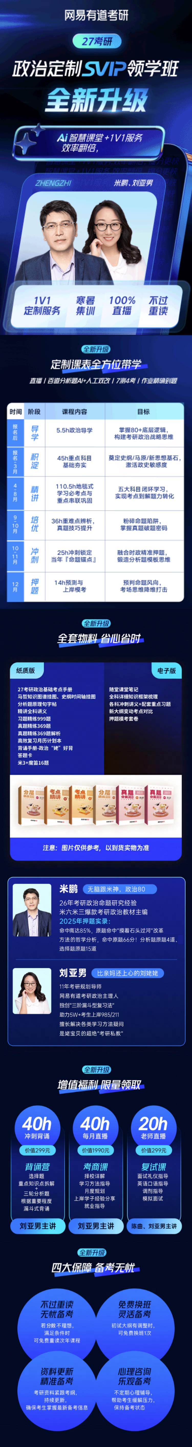 机构简介:网易有道考研 —— 一站式定制化考研备考知名品牌一、品牌介绍:网易有道考研是网易有道公司旗下核心考研备考品牌,成立于2016年,依托网易有道在智能学习技术与资源优势,在行业内率先提出 “从择校到复试的全科定制学习解决方案” 产品理念,为考研学子打造覆盖全备考周期、全科目维度的一站式定制学习平台,凭借科学规划与个性化服务,成为万千考生的考研上岸优选。围绕考研备考全流程,构建 “课程定制、练习定制、师资定制、服务定制、班群定制” 五大核心维度,实现从初期择校规划到复试通过的全场景覆盖:1、择校阶段:提供 1v1 择校规划服务,结合考生基础、目标专业与地域偏好,精准匹配适配院校,规避盲目择校风险;2、初试阶段:涵盖公共课(数学、英语、政治)、专业课(法硕、计算机 408、333 教育综合等)全科目课程,从 0 基础入门到冲刺押题,适配不同基础与备考节奏;3、复试阶段:配套面试礼仪、英语口语、调剂指导、模拟面试等专项课程,打通上岸最后一公里。二、师资介绍:汇聚考研界全科目实力老师,形成“老师课+1v1规划+学长姐定制” 的立体化教学矩阵:1、核心老师阵容:集合唐迟(英语)、武忠祥(数学)、米鹏(政治)、曲根(英语)等行业师资,深耕考研教学多年,洞悉命题规律与备考痛点;2、定制化教学支撑:配备目标院校直系学长姐,提供专业课 1v1 定制带学,传递内部备考资源与实战经验;3、专业服务团队:班主任、答疑老师、教研团队全程护航,确保教学与服务无缝衔接。三、智慧AI系统:依托网易有道完整技术平台与达尔文智能教学系统,以科技赋能因材施教,核心技术系统:涵盖课程直播录播系统、智能题库系统、全真模考系统、AI + 人工双改作业批改系统,实现学习全流程数字化;个性化学习辅助:AI 智能适配学习进度,推荐针对性课程与练习;生成个性化学习报告,精准定位薄弱环节;智能答疑工具 7x24 小时响应,及时扫清学习障碍;高效备考工具:整合考点梳理、真题分类、记忆提醒等功能,节省无效复习时间,提升备考效率。四、课程体系1、多元化课程矩阵,公共课系列:数学(武忠祥 0 基础课、全程班)、英语(作文班、词汇带背营)、政治(押题特训营、分析题背诵营),覆盖不同备考阶段需求;专业课系列:法硕(全年班、私塾班)、计算机 408(全程班、定校班)、333 教育综合(蜕变全程班)等,适配不同专业考生;2、全方位服务保障,定制化规划:入学即享 1 对 1 备考规划,动态调整学习计划,避免盲目复习;全程督学跟踪:班主任每日打卡、落课提醒、阶段测评,解决备考惰性;精准答疑服务:支持文字、图片等多种提问形式,24 小时内响应,群内答疑与 1v1 答疑灵活选择;完善售后支持:提供 7 天免费试学、无理由退还等权益,降低报名顾虑。网易有道作为网易旗下中国的智能学习公司,深耕教育领域十余年,拥有成熟的技术研发能力与教学服务经验。网易有道考研传承 “100% 以用户为导向” 的核心理念,将大数据、AI 技术与考研教学深度融合,通过持续优化产品与服务,助力考生高效备考、成功上岸,成为考研定制化备考领域的标杆品牌。
