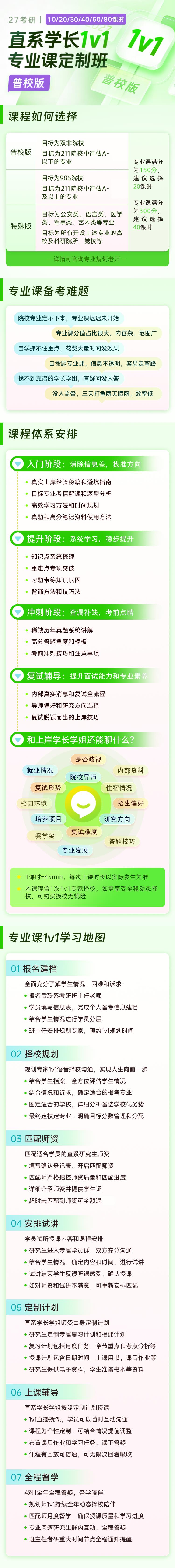 核心特色:以“定制化”为核心,直系学长结合目标院校专业课考纲、历年真题与自身备考经验,量身定制专属课表与学习计划,全方位带学;配套“7测4考”阶段性测评体系,作业精确到题,实时检验学习效果;