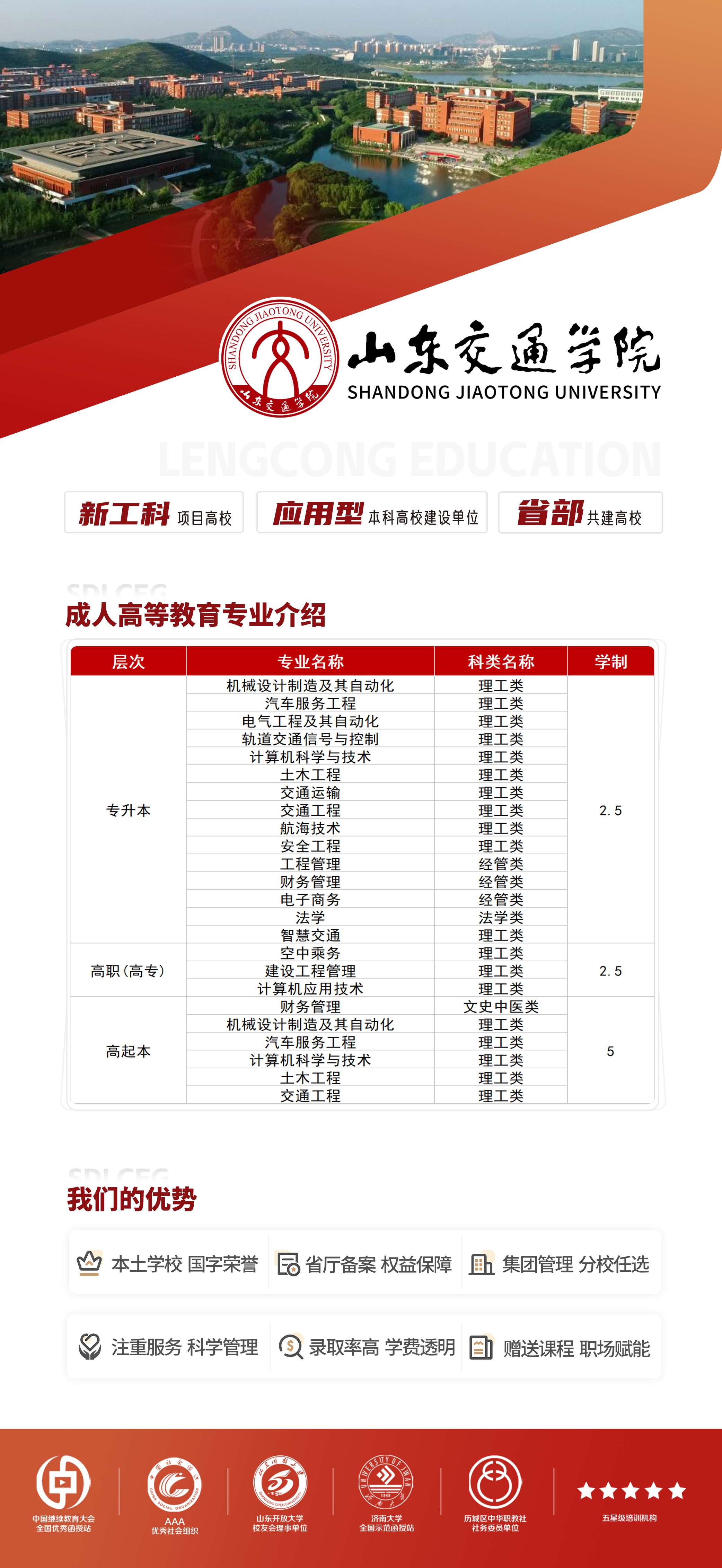 机构简介:山东领创教育集团成立于2007年,总部位于山东省会济南,韩国首尔设有海外分部。集团在职职工170余人,集团致力于继续教育事业,拥有成人学历教育、出国留学、职业培训三大业务板块。旗下拥有济南市历城区领创教育培训学校、济南市恒展职业培训学校等八个成人学历教育及职业教育办学主体单位,在东营、淄博、青岛、德州设有分校(部)。旗下山东领创蔚来国际教育咨询有限公司归口管理出国留学业务;济南育路教育科技有限公司(山东育路网sd.*****.com)归口管理国际学校等择校业务;山东微言教育科技有限公司归口管理职业培训业务。目前,成人学历在籍学生9200余人,职业教育培训7900余人次,出国留学累计输送1065人次。集团立足山东,以二十大报告中提出的“办好人民满意的教育,统筹职业教育、高等教育、继续教育协同创新”为办学方向,不忘初心,砥砺奋进,致力打造成为山东本土办学质量和办学声誉俱佳的教育品牌。2022年11月21日,经济南市历城区区委教育工委研究决定,中国共 产党济南市历城区领创教育培训学校支部委员会正式成立。 多年来,学校办学成果成效显著,2021-2023连续三年蝉联中国远程与继续教育大会全国优秀函授站(校外教学点)荣誉,被民政局评为3 A级“优秀社会组织”,被教育局评估为“优秀民办学校”,连续三年被济南大学评为成人高等教育“示范单位”,被山东理工大学、齐鲁工业大学、山东交通学院、山东开放大学等院校评为“优秀合作单位”“办学先进单位”,荣获山大路街道党委会“社区共建优秀企业”荣誉,荣获“扶贫助农”及慈善机构爱心捐赠行动企业荣誉。 集团自成立以来,随着学校文化建设的不断夯实,以“为之则安,笃行至善”为集团校训,以“服务社会、推送人才”为办学宗旨,贯彻“敬、悟、慎、新”的四字箴言,秉承“正心、正念、正道、正行”的价值观,践行“团结、紧张、严肃、活泼”的严谨校风和“主动、落地、守信、利他”的工作作风,与国内外40余所高等学府、科研机构、行业协会建立了合作关系,组织了50多名既有理论深度又有实战经验的专家团队,以精细的服务理念为学员赋能,得到了广大学员和社会的一致认可。