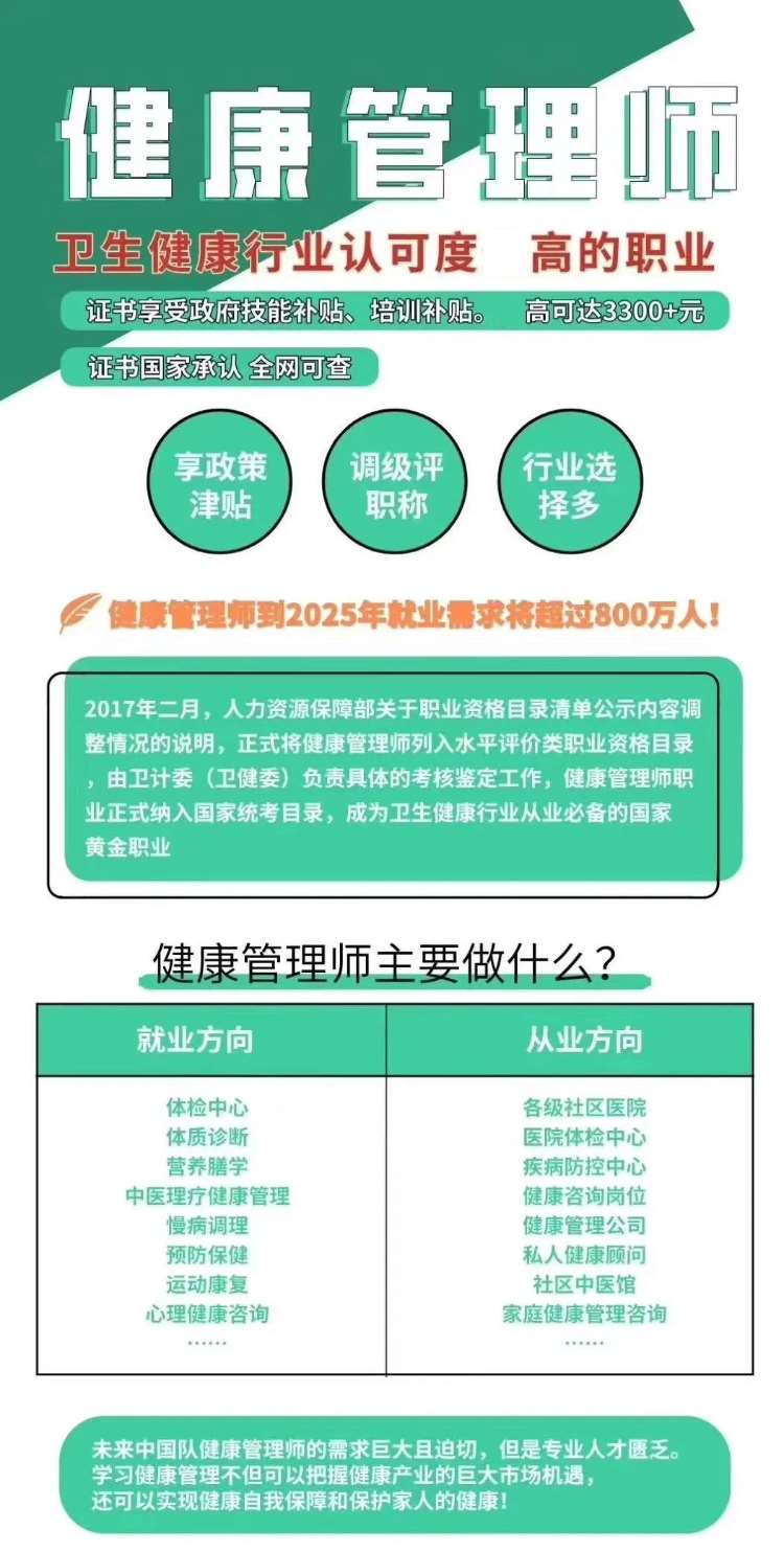 未来中国队健康管理师的需求巨大且迫切,但是专业人才匮乏。还可以实现健康自我保障和保护家人的健康!学习健康管理不但可以把握健康产业的巨大市场机遇。