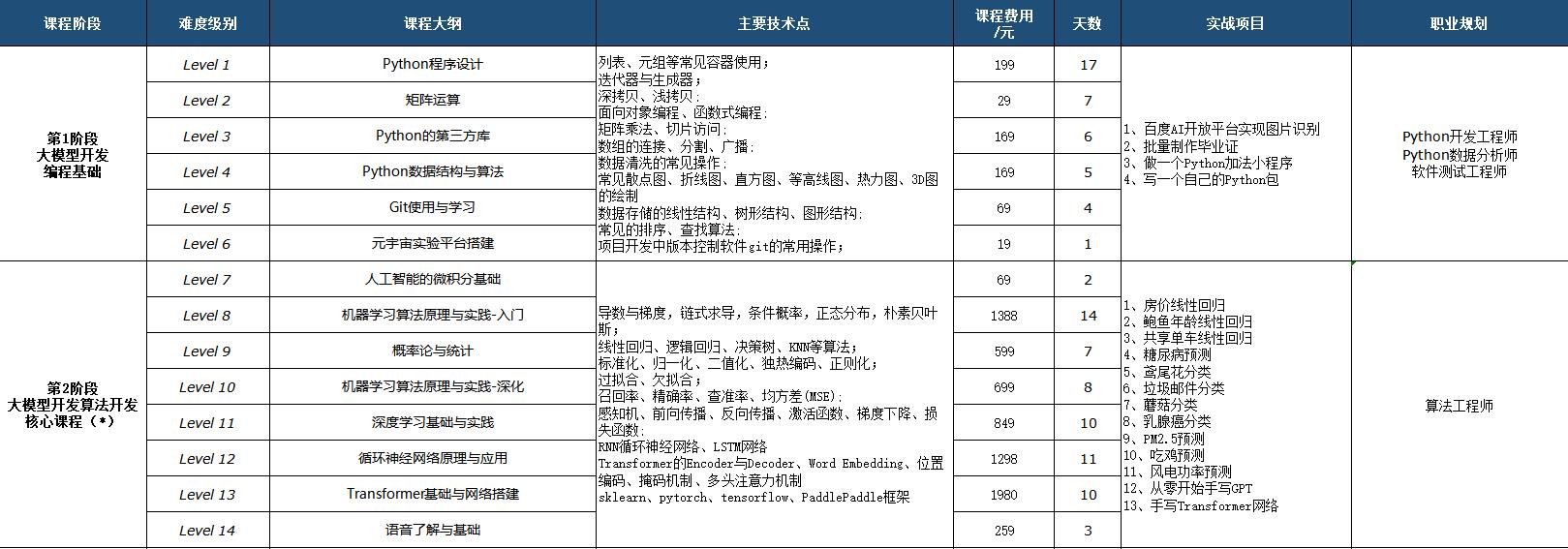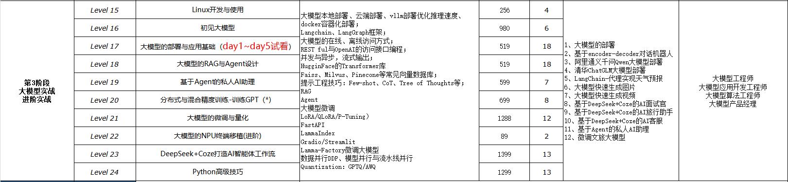 培养大模型算法应用工程师, 学员可以胜任机器学习工程师,NLP算法工程师/大模型应用开发工程师/大模型训练工程师/大模型训练与微调工程师,模型压缩工程师/模型压缩与部署工程师,数据标注员等岗位。