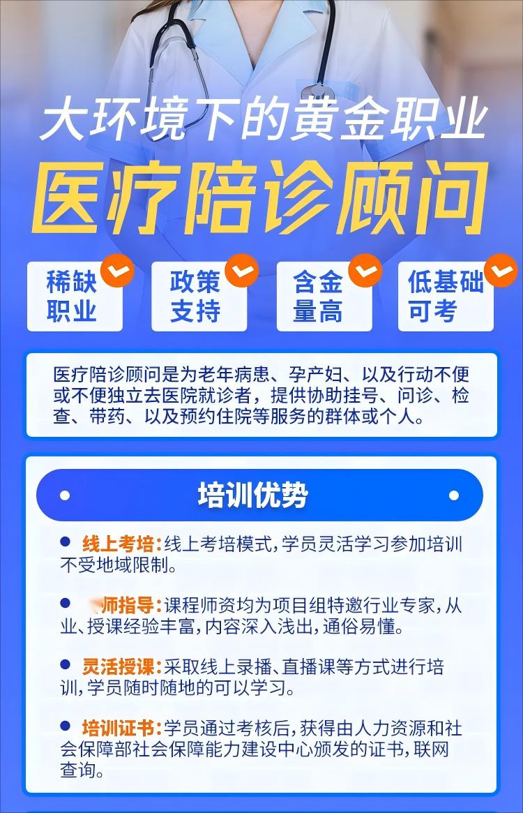 医疗陪诊顾问,当月报名当月学习,每月最后一个周日安排考试(以通知为准),完成规定课时学习即可参加,考试审核通过后45个工作日颁发培训证书。