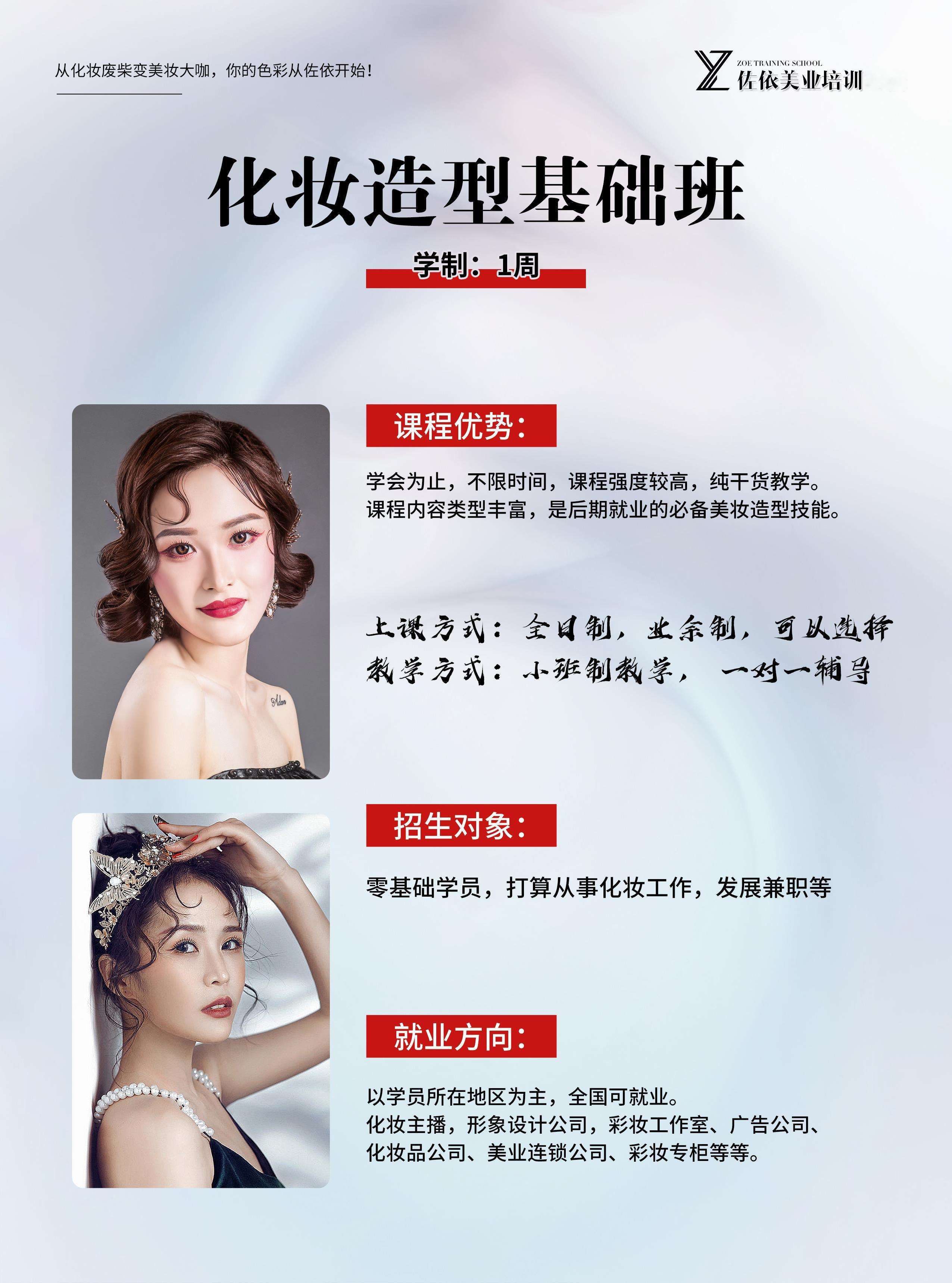 机构简介:佐依美业培训,省内直营连锁校区,总校创办于2012年,是一家专注于美容美体、化妆造型、美甲美睫、半永久纹绣、皮肤管理、摄影的技能培训。师资拥有10多名专业任课教师,教龄均在5年以上,完善的教学体系,理论+实操相结合,培养了一批又一批的美容师、美甲师、化妆师、纹绣师,学生遍布全国各地,也为行业输送了大量美业人才。承诺:1、小班化教学:一对一辅导,保证教学质量;2、包教学会:完成课时课程,如未考核通过或者自己觉得没学好,可以免费复学,直到学会为止;3、推荐就业:学员通过考核,将推荐安排就业,提供多个商家供学生选择,直到双方满意为止;4、免费进修:凡是毕业学生,凭毕业证后期10年内免费进修;5、消费透明:一次性收费,中途绝无二次隐形消费6、协助开店:毕业学生如需创业,学免费提供创业咨询,老师下店辅导