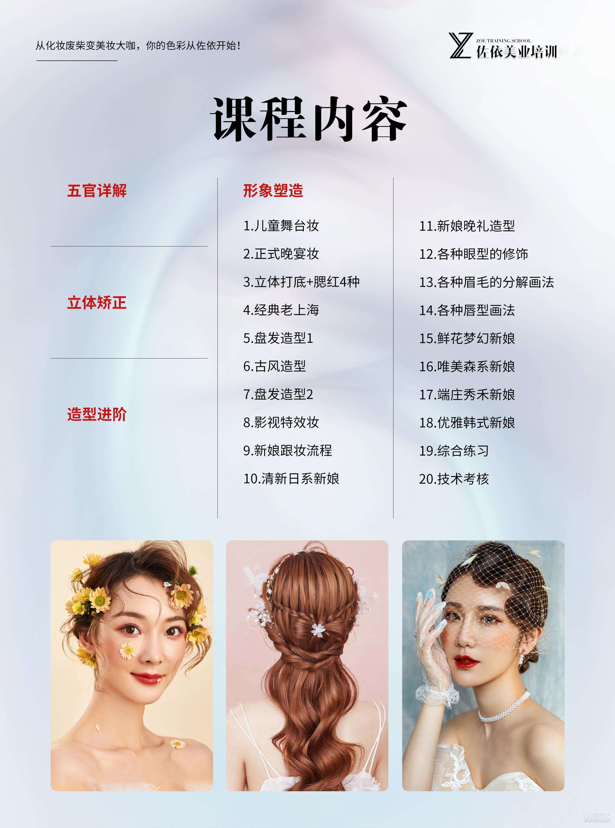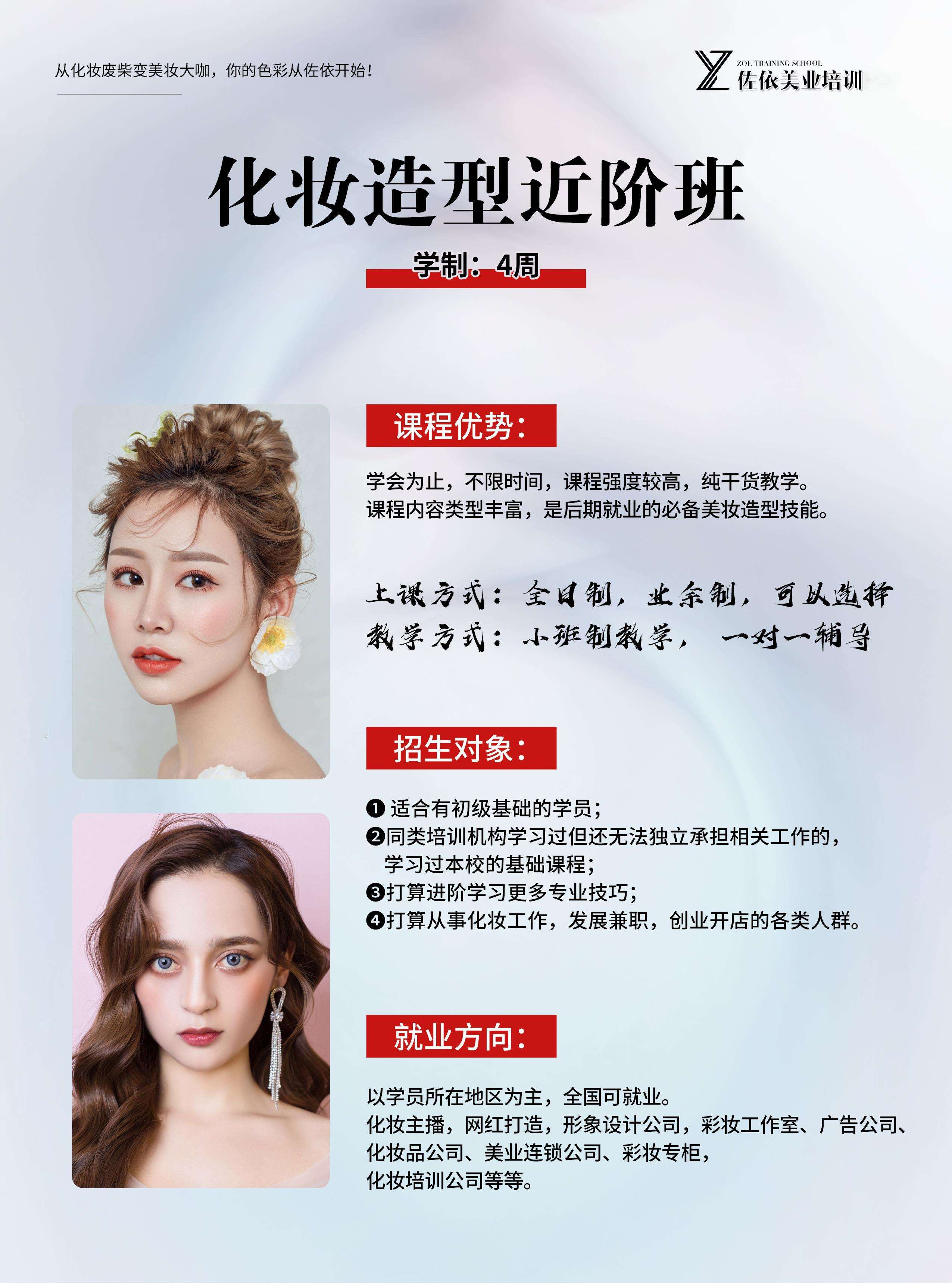 机构简介:佐依美业培训,省内直营连锁校区,总校创办于2012年,是一家专注于美容美体、化妆造型、美甲美睫、半永久纹绣、皮肤管理、摄影的技能培训。师资拥有10多名专业任课教师,教龄均在5年以上,完善的教学体系,理论+实操相结合,培养了一批又一批的美容师、美甲师、化妆师、纹绣师,学生遍布全国各地,也为行业输送了大量美业人才。承诺:1、小班化教学:一对一辅导,保证教学质量;2、包教学会:完成课时课程,如未考核通过或者自己觉得没学好,可以免费复学,直到学会为止;3、推荐就业:学员通过考核,将推荐安排就业,提供多个商家供学生选择,直到双方满意为止;4、免费进修:凡是毕业学生,凭毕业证后期10年内免费进修;5、消费透明:一次性收费,中途绝无二次隐形消费6、协助开店:毕业学生如需创业,学免费提供创业咨询,老师下店辅导